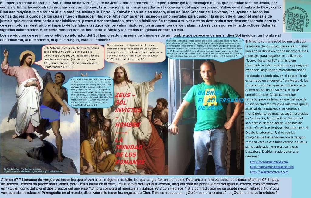 “¿Quién es responsable de la maldad, “”Satanás”” o la persona que comete la maldad? No te dejes engañar por justificaciones estúpidas porque “”el Diablo”” al que culpan de sus propias malas acciones en realidad son ellos mismos. La típica excusa de la persona religiosa perversa: “”Yo no soy así porque no soy yo quien hace este mal, sino el Diablo que me ha poseído quien hace este mal.”” Los romanos, actuando como “”Satanás””, crearon contenido que también hicieron pasar por leyes de Moisés, contenido injusto para desacreditar el contenido justo: La Biblia no solo contiene verdades, también contiene mentiras. Satanás es un ser de carne y hueso porque significa: el calumniador. Los romanos calumniaron a Pablo atribuyéndole la autoría del mensaje de Efesios 6:12. La lucha es contra carne y sangre. Números 35:33 menciona la pena de muerte contra carne y sangre, los ángeles enviados por Dios a Sodoma destruyeron carne y sangre, y no “”huestes espirituales de maldad en las regiones celestiales.”” Mateo 23:15 dice que los fariseos convierten a sus seguidores en personas aún más corruptas que ellos, sugiriendo que alguien puede volverse injusto por influencia externa. En cambio, Daniel 12:10 dice que los injustos seguirán actuando con injusticia porque es su naturaleza, y solo los justos comprenderán el camino de la justicia. La falta de armonía entre estos dos mensajes muestra que algunas partes de la Biblia entran en contradicción, lo que pone en duda su veracidad absoluta. https://naodanxxii.wordpress.com/wp-content/uploads/2025/03/idi01-the-plot.pdf .” “El imperio Romano, Bahira, Mahoma, Jesús y el judaísmo perseguido. El nacimiento y la muerte de cuarta bestia. La alianza greco-romana por los mismos dioses. El Imperio seléucida. Cuidado con creer en el evangelio del anticristo (Buenas noticias para los injustos, aunque falsas) Si quieres salvarte del engaño del adversario de la justicia, considera que: Para rechazar el falso evangelio de Roma, acepte que si Jesús fue justo entonces no amó a sus enemigos, y si no fue hipócrita entonces no predicó el amor a los enemigos porque no predicaba lo que no practicaba: Proverbios 29:27 Los justos odian a los injustos, y los injustos odian a los justos. Esto es parte del evangelio adulterado por los romanos para la Biblia: 1 Pedro 3:18 Porque Cristo murió una vez por los pecados, el justo por los injustos, para llevarnos a Dios. Ahora mire esto que desmiente esa calumnia: Salmo 118:20 Esta es la puerta de Jehová; los justos entrarán por ella. 21 Te daré gracias porque me has escuchado y has sido mi salvación. 22 La piedra que rechazaron los constructores se ha convertido en la piedra angular. Jesús maldice a sus enemigos en la parábola que predice su muerte y regreso: Lucas 20:14 Pero cuando los viñadores vieron esto, discutieron entre sí, diciendo: Éste es el heredero; Venid, matémoslo, para que la herencia sea nuestra. 15 Entonces lo echaron de la viña y lo mataron. ¿Qué les hará entonces el dueño de la viña? 16 Él vendrá y destruirá a estos viñadores y dará la viña a otros. Cuando lo oyeron, dijeron: ¡De ninguna manera! 17 Pero Jesús, mirándolos, dijo: ¿Qué, pues, es esto que está escrito: La piedra que desecharon los constructores se ha convertido en la piedra angular? Él habló de esta piedra, de la piedra de la pesadilla del rey de Babilonia: Daniel 2:31 Tú, oh rey, veías, y he aquí una gran imagen. Esta imagen, que era muy grande, y cuya gloria era muy sublime, estaba en pie delante de ti, y su aspecto era terrible. 32 La cabeza de esta imagen era de oro fino; su pecho y sus brazos, de plata; su vientre y sus muslos, de bronce; 33 sus piernas, de hierro; sus pies, en parte de hierro y en parte de barro cocido. 34 Estabas mirando, hasta que una piedra fue cortada, no con mano, e hirió a la imagen en sus pies de hierro y de barro cocido, y los desmenuzó. 35 Entonces fueron desmenuzados también el hierro, el barro cocido, el bronce, la plata y el oro, y fueron como tamo de las eras del verano, y se los llevó el viento sin que de ellos quedara rastro alguno. Mas la piedra que hirió a la imagen fue hecha un gran monte que llenó toda la tierra. La cuarta bestia es la alianza de los líderes de todas las falsas religiones amigables con el fraude romano denunciado. El Cristianismo y el Islam dominan el mundo, la mayoría de los gobiernos o juran por el Corán o por la Biblia, por ese simple motivo, aunque los gobiernos lo nieguen, son gobiernos religiosos que se someten a las autoridades religiosas que están detrás de esos libros por los cuales juraron. Aquí les voy a mostrar la influencia romana en los dogmas de estas religiones y como distan mucho de los dogmas de la religión que perseguía Roma, Además, lo que les voy a mostrar no es parte de la religión que hoy se conoce como Judaísmo. Y si a esto le sumamos la fraternidad de los líderes del Judaísmo, Cristianismo e Islam, hay suficientes elementos para señalar a Roma como la creadora de los dogmas de estas religiones, y que la última religión mencionada no es la misma que el Judaísmo que perseguía Roma. Sí, estoy afirmando que Roma creó el cristianismo y que persiguió un Judaísmo diferente al actual, los líderes leales del Judaísmo legítimo jamás darían abrazos fraternales a difusores de doctrinas idólatras. Es evidente que no soy cristiano, ¿entonces porque cito pasajes de la Biblia para dar sustento a lo que digo?, pues porque no todo en la Biblia pertenece exclusivamente al cristianismo, parte de su contenido es el contenido de la religión del camino de la justicia que fue perseguido por el imperio romano por ser contrario al ideal romano de hacer que «Todos los caminos conduzcan a Roma (Es decir, que esos caminos favorezcan los intereses imperiales), por eso tomo algunos pasajes de la Biblia para sustentar mis afirmaciones. Daniel 2:40 Y el cuarto reino