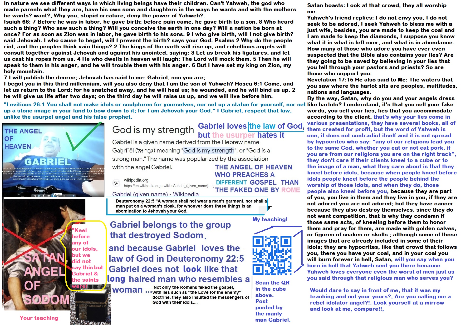 I made the mistake of defending the faith in the Bible, but out of ignorance. However, now I see that it is not the guiding book of the religion that Rome persecuted, but of the one it created to please itself with celibacy. That’s why they preached a Christ who doesn’t marry a woman, but rather His church, and angels who, despite having male names, do not look like men (draw your own conclusions). These figures are akin to the false saints—plaster-statue kissers—and similar to the Greco-Roman gods because, in fact, they are the same pagan gods under different names.