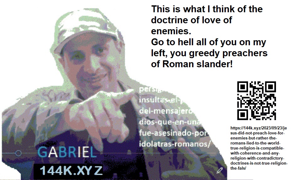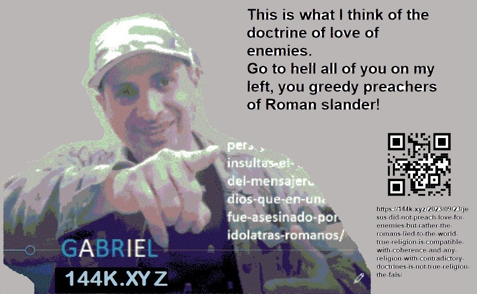 Amo a mi prójimo como a mi mismo, pero no todos son mi prójimo, mi prójimo son los justos, si todos fuesen el prójimo, nadie habría asesinado a los santos, ni nadie hubiese escondido sus palabras, ni nadie hubiese falsificado las palabras de los santos, ni yo tendría ninguna necesidad de hacer este juicio justo a favor de mi prójimo y en perjuicio de nuestros enemigos, pues nadie hubiese calumniado contra mi como lo hacen los enemigos de mi prójimo, es que no es lo mismo oveja que lobo, aunque la oveja este desorientada o descarriada por su ignorancia, oveja es y el pastor desea salvarla, en cambio el lobo, aunque se vista de oveja, lobo sigue siendo y no puede convertirse jamás en oveja, el buen pastor no solo apacienta a las ovejas, él tambien caza a los lobos, como lobos son los calumiadores, los lobos del imperio romano, que tienen por madre de los fundadores de Roma, no de casualidad, a una loba. Esos son los que han calumniado contra los santos, y ellos son los grandes perdedores en el juicio final, es que el juicio final no perjudica a todos ni beneficia a todos, por eso muchos conspiraron contra el juicio final pues saben por su asquerosa conciencia que lo que hacen es injusto. https://gabriels.work/2024/09/17/el-abogado-de-los-secuestradores-argumenta-con-argumentos-religiosos-no-exijan-lo-que-es-suyo-y-amen-a-sus-enemigos-lucas-1630-a-todo-el-que-te-pida-dale-y-al-que-tome-lo-que-es-tuyo-no-se-lo-r/