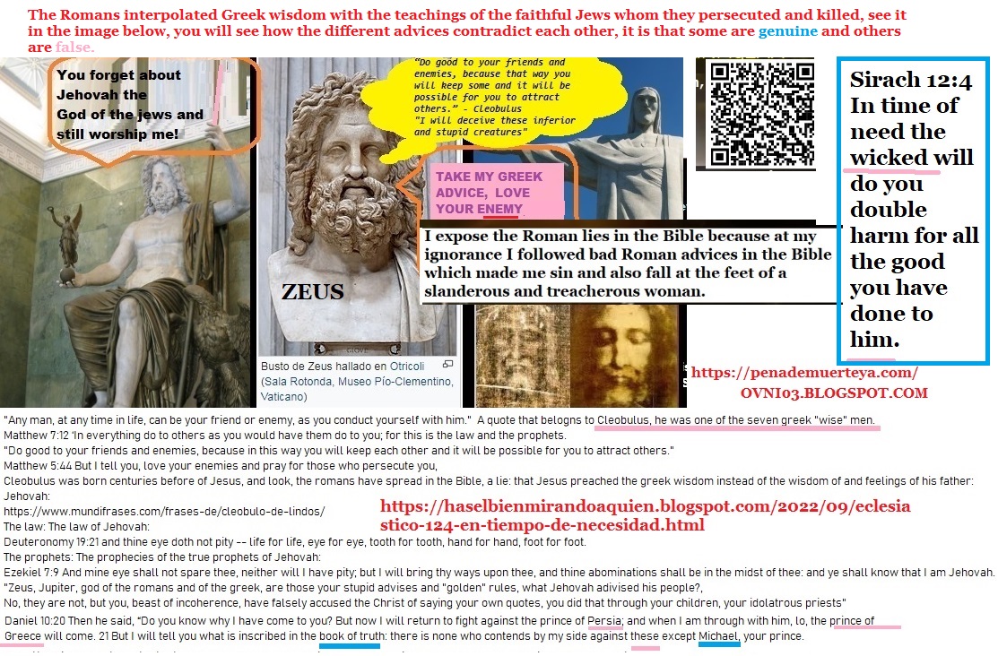 | 163 | @JoseElsegador hace 0 segundos Can you conceive of the lion of Judah sharing food, including pork, at a table with Antiochus IV Epiphanes, that king who wanted to Hellenize the faith of the Jews and killed some of them for refusing to eat pork? Can you conceive of him saying: “His wickedness is forgiven because he accepted me as his only savior and lord, and because he believed me when I said “eat everything because I am above the law: Deuteronomy 14 and Leviticus 11 are part of the past”, because he believes me when I said: “No to justified revenge, love your enemy because Numbers 35:33 is also part of the past, it is a commandment that stopped being justice with my arrival”, “Eat everything because my “words weigh more than the words of the prophet Isaiah (Isaiah 65, Isaiah 66).” It does not make sense that the Lion of Judah is that man with long hair who looks like the Greek god Zeus, the god of Antiochus IV of Epiphanes, and that he also said: “Nothing that enters a man’s mouth contaminates him.” “(Matthew 15:11), because that is an insult to the faith of those seven brothers and their mother, who for love of God’s law regarding forbidden foods were martyred by that Greek king, those martyrs had faith in that by dying for the laws of their God, they would live again to inherit eternal life. Let us remember that those Jews did not want to adopt Greek customs (2 Maccabees 7), but the Romans could get along with such customs, which is why you have what you find in the Bible: myths and Hellenism contradicting Jewish truths: a terrible graft. |