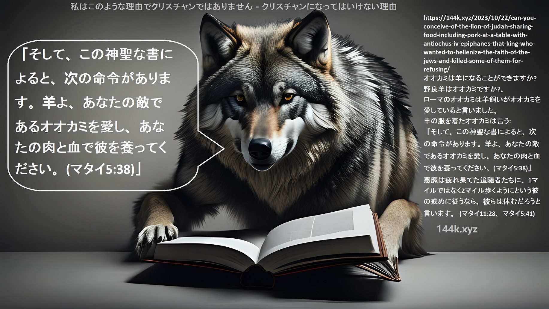 「そして、この神聖な書によると、次の命令があります。羊よ、あなたの敵であるオオカミを愛し、あなたの肉と血で彼を養ってください。(マタイ5:38)」