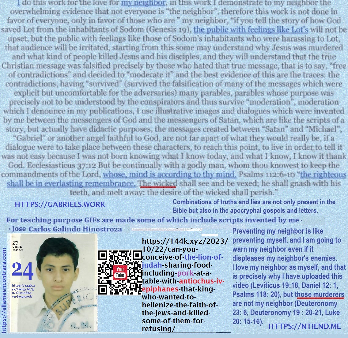 Amo a mi prójimo como a mi mismo, pero no todos son mi prójimo, mi prójimo son los justos, si todos fuesen el prójimo, nadie habría asesinado a los santos, ni nadie hubiese escondido sus palabras, ni nadie hubiese falsificado las palabras de los santos, ni yo tendría ninguna necesidad de hacer este juicio justo a favor de mi prójimo y en perjuicio de nuestros enemigos, pues nadie hubiese calumniado contra mi como lo hacen los enemigos de mi prójimo, es que no es lo mismo oveja que lobo, aunque la oveja este desorientada o descarriada por su ignorancia, oveja es y el pastor desea salvarla, en cambio el lobo, aunque se vista de oveja, lobo sigue siendo y no puede convertirse jamás en oveja, el buen pastor no solo apacienta a las ovejas, él tambien caza a los lobos, como lobos son los calumiadores, los lobos del imperio romano, que tienen por madre de los fundadores de Roma, no de casualidad, a una loba. Esos son los que han calumniado contra los santos, y ellos son los grandes perdedores en el juicio final, es que el juicio final no perjudica a todos ni beneficia a todos, por eso muchos conspiraron contra el juicio final pues saben por su asquerosa conciencia que lo que hacen es injusto. https://gabriels.work/2024/09/17/el-abogado-de-los-secuestradores-argumenta-con-argumentos-religiosos-no-exijan-lo-que-es-suyo-y-amen-a-sus-enemigos-lucas-1630-a-todo-el-que-te-pida-dale-y-al-que-tome-lo-que-es-tuyo-no-se-lo-r/