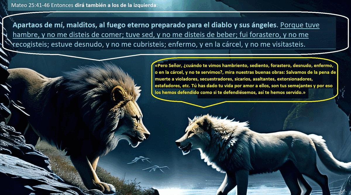 El lobo te dice que le hagas el bien a tu enemigo, el lobo te pide que ames a tus enemigos, tu enemigo te maldice pero te pide que tú lo bendigas, pero tú frente al lobo actúa como león y no como oveja, frente a las ovejas actúa como oveja y no como león, no hagas ningún bien a los lobos, pero aunque el lobo se vista de oveja se la reconoce por sus apetitos, apetitos que no puede dismimular, el lobo acercará el hocico al olor de carne fresca, cosa que no hace la oveja.