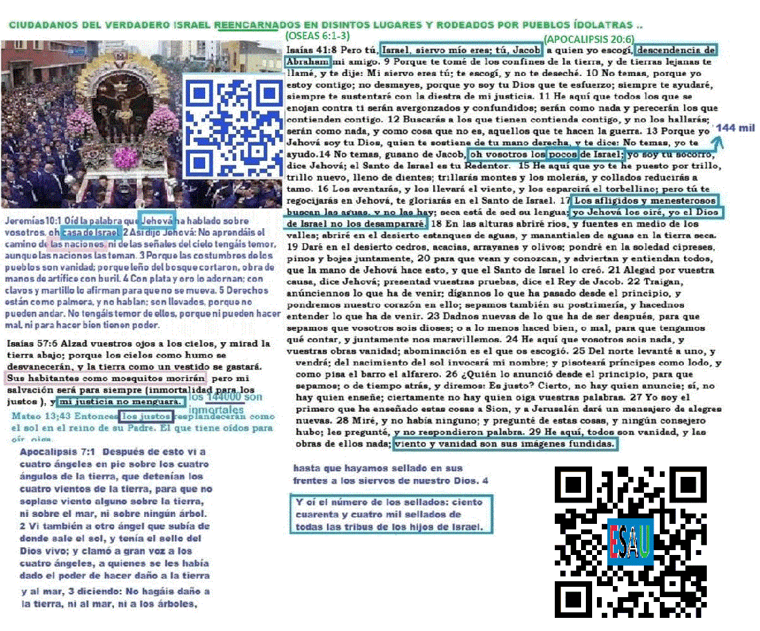 Tengo bastante tiempo ya diciendo esto, los justos son aquel Israel a favor del cual hablan las profecías para el tiempo del fin, ellos son los justos que han reencarnado en diferentes partes del mundo, no estamos hablando aquí de las personas nacidas en un territorio en específico o de un país geográfico en particular. Hablamos de un grupo de personas que tienen como característica común el apego a la justicia.