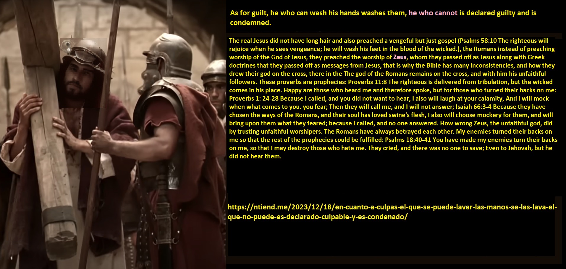 The real Jesus did not have long hair and also preached a vengeful but just gospel (Psalms 58:10 The righteous will rejoice when he sees vengeance; he will wash his feet in the blood of the wicked.), the Romans instead of preaching worship of the God of Jesus, they preached the worship of Zeus, whom they passed off as Jesus along with Greek doctrines that they passed off as messages from Jesus, that is why the Bible has many inconsistencies, and how they drew their god on the cross, there in the The god of the Romans remains on the cross, and with him his unfaithful followers. These proverbs are prophecies: Proverbs 11:8 The righteous is delivered from tribulation, but the wicked comes in his place. Happy are those who heard me and therefore spoke, but for those who turned their backs on me: Proverbs 1: 24-28 Because I called, and you did not want to hear, I also will laugh at your calamity, And I will mock when what comes to you. you fear; Then they will call me, and I will not answer; Isaiah 66:3-4 Because they have chosen the ways of the Romans, and their soul has loved swine’s flesh, I also will choose mockery for them, and will bring upon them what they feared; because I called, and no one answered. How wrong Zeus, the unfaithful god, did by trusting unfaithful worshipers. The Romans have always betrayed each other. My enemies turned their backs on me so that the rest of the prophecies could be fulfilled: Psalms 18:40-41 You have made my enemies turn their backs on me, so that I may destroy those who hate me. They cried, and there was no one to save; Even to Jehovah, but he did not hear them.