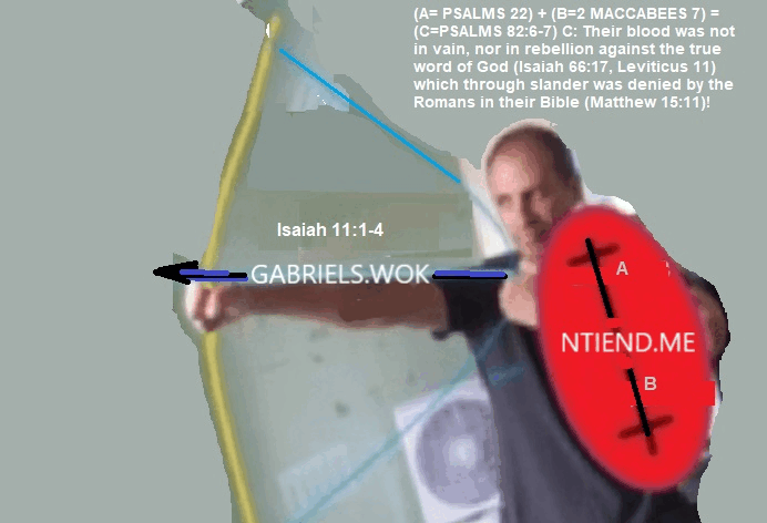 (A= PSALMS 22) + (B=2 MACCABEES 7) = (C=PSALMS 82:6-7) C: Their blood was not in vain, nor in rebellion against the true word of God (Isaiah 66:17, Leviticus 11) which through slander was denied by the Romans in their Bible (Matthew 15:11)! Revelation 12:11 They triumphed over him by the blood of the Lamb and by the word of their testimony; they did not love their lives so much as to shrink from death.