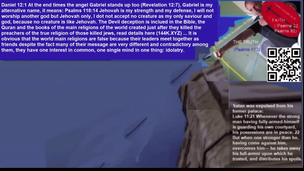 Daniel 12:1 At the end times the angel Gabriel stands up too (Revelation 12:7), Gabriel is my alternative name, it means: Psalms 118:14 Jehovah is my strength and my defense, I will not worship another god but Jehovah only, I dot not accept no creature as my only saviour and god, because no creature is like Jehovah. The Devil deception is inclued in the Bible, the Quran and the books of the main religions of the world created just after they killed the preachers of the true religion of those killed jews, read details here… It is obvious that the world main religions are false because their leaders meet together as friends despite the fact many of their message are very different and contradictory among them, they have one interest in common, one single mind in one thing: idolatry.