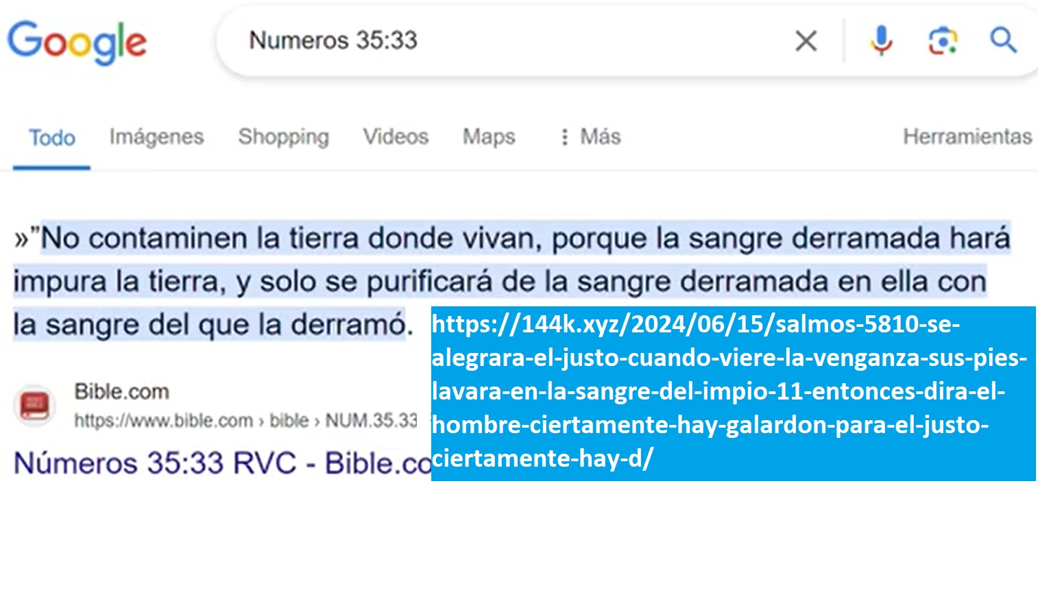 Números 35:33 ”No contaminen la tierra donde vivan, porque la sangre derramada hará impura la tierra, y solo se purificará de la sangre derramada en ella con la sangre del que la derramó.