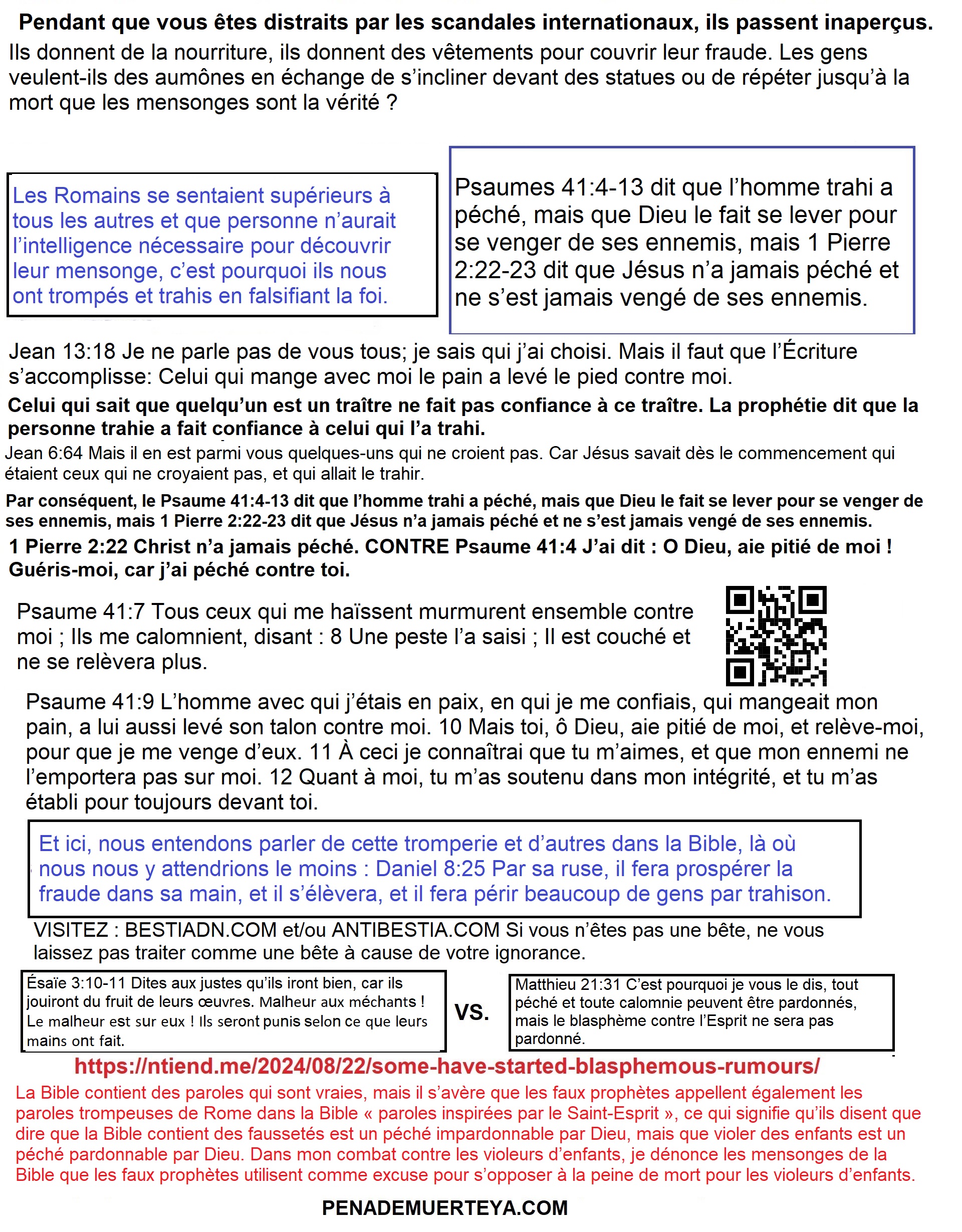 Les Bibles utilisées par les catholiques et les protestants ont en commun des mensonges romains, l’un d’eux étant la doctrine de l’amour de ses ennemis. Les faux prophètes prônent des mensonges de ce genre pour s’opposer à la peine de mort. Les vérités juives de la Bible nient les mensonges romains de la Bible, mais il y a même des mensonges romains dans certains messages qui auraient été écrits avant Jésus-Christ et qui sont dans la Bible. Les messages de haine des ennemis dans le Psaume 139:19-22 et l’Apocalypse 6:9-10 sont liés aux messages de Matthieu 7:22 et du Psaume 58:10. Cela montre que le message de Matthieu 5:38-48 est une tromperie romaine et que Jésus ne s’est jamais rebellé contre la loi œil pour œil (la peine de mort). Lorsque les faux prophètes obligent les gouvernements à ne pas appliquer la peine de mort par exemple, pour les pasteurs et les prêtres qui violent des enfants, en s’opposant à la peine de mort en général, les extorqueurs gagnent du terrain dans de nombreux pays du monde, ils menacent et tuent des gens travailleurs et entreprenants sans ressentir aucune peur, comme nous le voyons tous les jours dans les nouvelles. Puisque vous êtes informés, prenez une décision, soit vous soutenez les faux prophètes, soit vous êtes avec les gens de bien. La pensée incohérente de la bête est celle-ci : Dieu a livré un homme juste, afin que moi, l’injuste, je ne sois pas condamné. Cependant, les messages dans Proverbes 29:27 et Proverbes 17:15 nient cela. PENADEMUERTEYA.COM