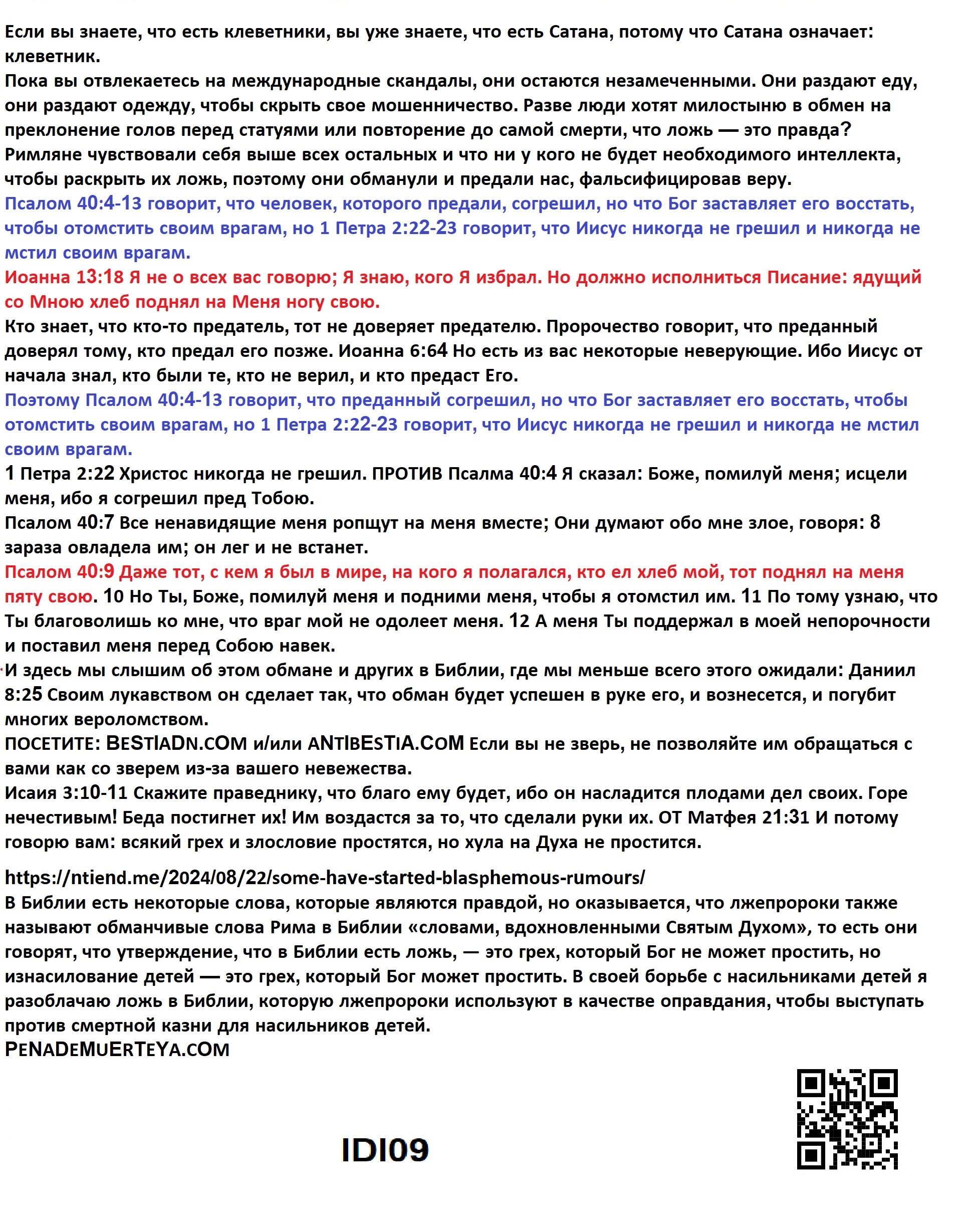 Библию, используемую католиками и протестантами, объединяет римская ложь, одна из которой — учение о любви к врагам. Лжепророки пропагандируют такую ложь, чтобы противостоять смертной казни. Еврейские истины в Библии отрицают римскую ложь в Библии, но римская ложь есть даже в некоторых сообщениях, которые предположительно были написаны до Христа и находятся в Библии. Сообщения о ненависти к врагам в Псалме 139:19-22 и Откровении 6:9-10 связаны с сообщениями в Матфея 7:22 и Псалме 58:10. Это показывает, что сообщение в Матфея 5:38-48 является римским обманом и что Иисус никогда не восставал против закона «око за око» (смертной казни). Когда лжепророки заставляют правительства не применять смертную казнь, например, для пасторов и священников, которые насилуют детей, выступая против смертной казни в целом, вымогатели набирают силу во многих странах мира, они угрожают и убивают трудолюбивых и предприимчивых людей, не испытывая никакого страха, как мы видим каждый день в новостях. Поскольку вы были проинформированы, примите решение, либо вы поддерживаете лжепророков, либо вы с людьми добра. Несвязная мысль зверя такова: Бог отдал праведника, чтобы я, неправедный, не был осужден. Однако сообщения в Притчах 29:27 и Притчах 17:15 отрицают это. PENADEMUERTEYA.COM