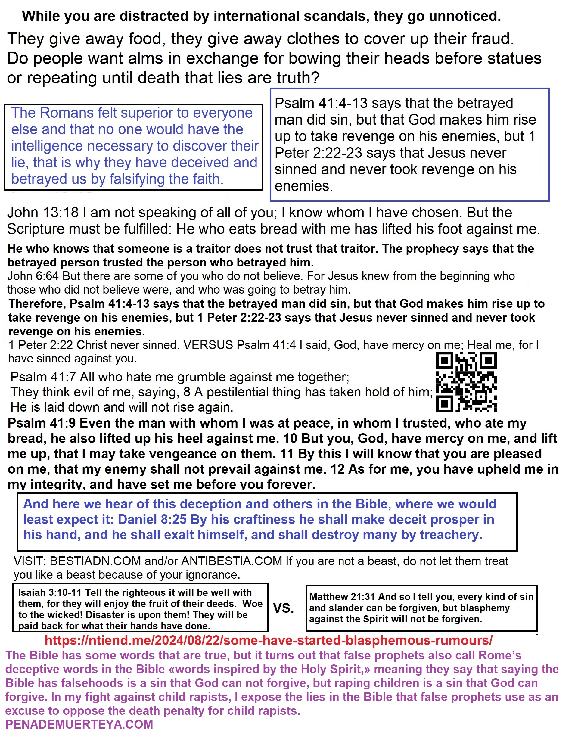 La pena de muerte debe ser legalizada con urgencia dentro de un marco legal justo a prueba de corrupción, en el cual por ejemplo al testigo falso que busque con su falsa acusación la muerte de un inocente, o al juez que busque librar de la muerte a un extorsionador o un asesino, también se le condene a muerte, y nunca se debe confundir al verdugo justiciero con un asesino condenado a muerte con justicia, porque nunca fue, ni es, ni será lo mismo, aunque las mafias de los falsos profetas, sucesores de los perseguidores romanos, los hayan querido equiparar al oponerse a la justicia, como injustos que son. Solo así, y con ayuda de la ciencia forense tan avanzada que tenemos, nos aseguraríamos de condenas rápidas y justas. La falta de pena de muerte no está funcinando, vemos como las extorsiones crecen, los extorsionadores matan sin temor porque no hay pena de muerte. El Salvador con su megacárcel solo está guardando problema no terminándolo. Es más caro mantener extorsionadores en cárceles que fusilarlos. Los malos no cambian, por eso no merecen que se les respete la vida a aquellos quienes no respetaron las vidas ajenas y las quitaron con injusticia. Casi todos los capturados son reincidentes. Los buenos y los malos se equivocan a veces, pero eso no les quita que sean buenos o malos. ¿Cómo nos aseguramos de que el derecho a la vida se respete si no condenamos a muerte a quienes no lo hagan?, tenerlos en cárcel es costoso, la pena de muerte es el castigo justo que se merecen los que matan con injusticia. Y justo sería que solo quienes defienden la vida de esos asesinos sean sus víctimas y no los que les deseamos la pena de muerte. Muchos usan a Dios como excusa para decirle no a la justicia, muchos usan a Dios como pretexto para decirle no a la pena de muerte. De esto hablo en ese video. Dios dictó la pena de muerte con justicia, pero en la Biblia encontrarás pasajes contradictorios tanto en el nuevo y en el antiguo testamento, y la explicación a eso es una: Una vez que los romanos tomaron el control de Jesuralén y mataron a los que tenían la religión de Moisés, ellos se dedicaron a destruir los fundamentos de la religión de los judíos, y así ellos crearon el contenido de la Biblia, en base a una mezcla de frases griegas, mensajes pro helenisticos que contradicen dogmas de la religión perseguida por ellos, los restos de los mensajes de la religión perseguida que quedan en la Biblia se contradicen con los mensajes injertados por los injustos romanos. De algunas de esas contradicciones hablo en este breve video. Y si nos remitimos a mensajes en la Biblia que no niegan ni los falsos profetas ni los justos, entonces: Si Dios hubiese creado a los malos capaces de convertirse en buenos, entonces Dios hubiese dictado para ellos conversión o terapias de inserción a la sociedad, y no la pena de muerte, y en ese caso este mandamiento hubiese sido un sin sentido: Números 35:33 No contaminen la tierra donde vivan (con asesinatos), porque la sangre derramada hará impura la tierra, y solo se purificará de la sangre derramada en ella (con ajusticiamientos), con la sangre del que la derramó. Si el malvado se pudiera convertir en justo, este mensaje sería falso: Daniel 12:10 Muchos serán limpios, y emblanquecidos y purificados; los impíos procederán impíamente, y ninguno de los impíos entenderá, pero los entendidos comprenderán. El Papa Francisco se opone a la pena de muerte diciendo que fomenta la venganza y no la justicia, él niega la verdad, como lo hicieron los perseguidores romanos, si no existiesen las venganzas amigables con la justicia, ¿Qué significa esto?: Salmos 58:10 Se alegrará el justo cuando viere la venganza; Sus pies lavará en la sangre del impío. 11 Entonces dirá el hombre: Ciertamente hay galardón para el justo; Ciertamente hay Dios que juzga en la tierra. Si debiésemos dejarle todo lo que es justicia a Dios y quedarnos de brazos cruzados sin actuar como sus herramientas de justicia, ¿Qué significa esta órden de Dios?: Apocalipsis 18:6 Dadle a ella como ella os ha dado, y pagadle doble según sus obras; en el cáliz en que ella preparó bebida, preparadle a ella el doble. 7 Cuanto ella se ha glorificado y ha vivido en deleites, tanto dadle de tormento y llanto; porque dice en su corazón: Yo estoy sentada como reina, y no soy viuda, y no veré llanto; 8 por lo cual en un solo día vendrán sus plagas; muerte, llanto y hambre, y será quemada con fuego; porque poderoso es Dios el Señor, que la juzga. https://penademuerteya.com https://ntiend.me
