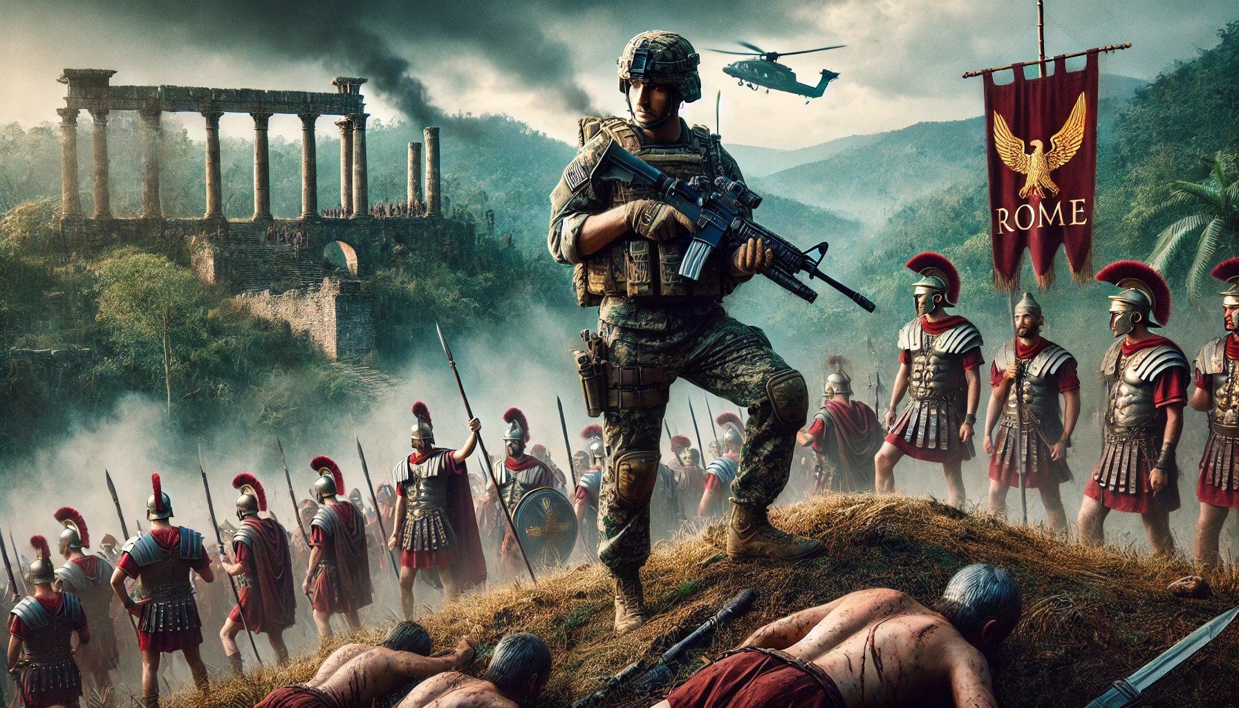 Before he could get his bearings, a group of soldiers appeared. They wore shiny helmets, rectangular shields, and spears. They were Roman legionaries. Their gazes fell on Jack and his camouflage uniform, clearly foreign and strange. One of them shouted something in Latin, and the group advanced towards him with obvious hostility.