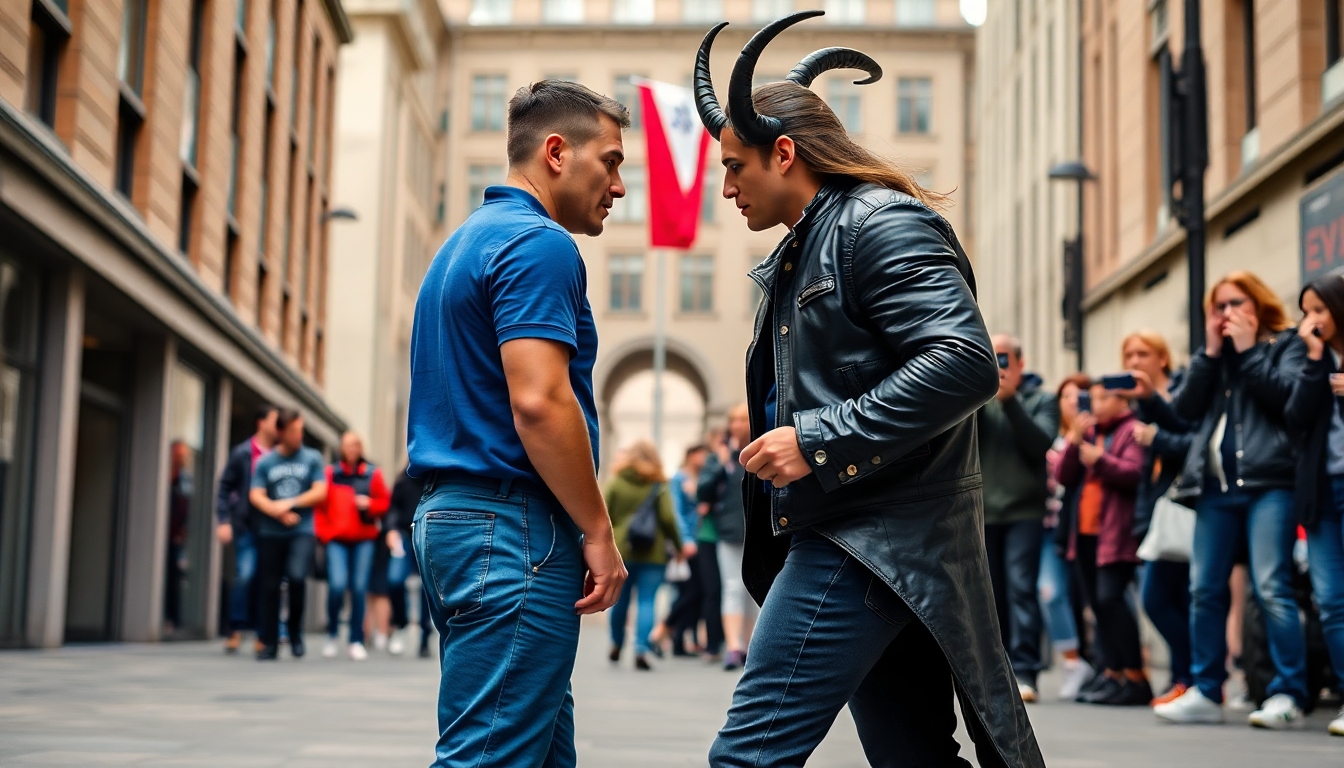 “Un confronto tra due figure umane in un ambiente urbano contemporaneo. A sinistra, il dio minore giusto, un uomo dai capelli corti, dall’aspetto virile e dal volto determinato. Indossa abiti casual e semplici, come pantaloni scuri e una maglietta o polo neutra, mostrando umiltà e concentrazione sui suoi obiettivi giusti. È solo, trasmette indipendenza e fermezza nei suoi principi. A destra, Satana, raffigurato come un idolo dello sport con i capelli lunghi, che indossa abiti appariscenti come una giacca firmata e jeans attillati, circondato da fan che cercano la sua attenzione e i suoi autografi. Il suo volto riflette carisma superficiale e arroganza seducente. L’ambientazione mostra una strada trafficata con edifici moderni e pubblicità luminose, in contrasto tra le due personalità”.
