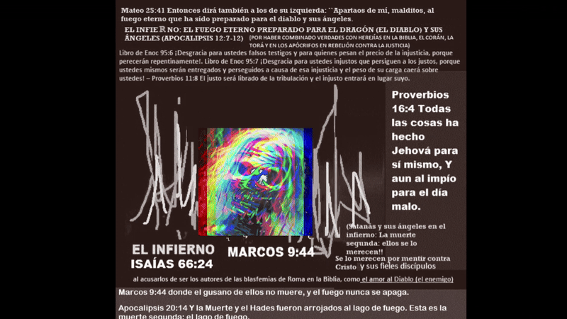 Apocalipsis 14:9-10 “Si alguno adora a la bestia (1 Corintios 2:14) y a su imagen (Éxodo 20:4-5, Daniel 3:1-6), y recibe la marca en su frente (Juan 8:44-45, 1 Juan 4:3 (Salmos 110, Salmos 118:6-26 (Mateo 21:37-44))) o en su mano (Mateo 7:16, 2 Corintios 11:15, Apocalipsis 9:20) él también beberá del vino de la ira de Dios, que ha sido vaciado puro en el cáliz de su ira; y será atormentado con fuego y azufre delante de los santos ángeles y del Cordero;”
