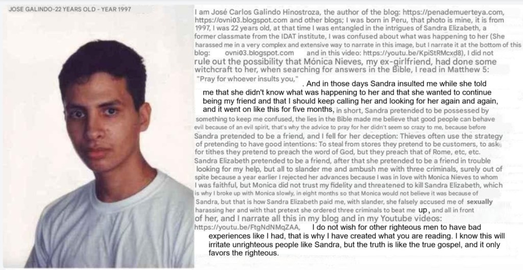 Un duro golpe de realidad es a «Babilonia» la «resurrección» de los justos, que es a su vez la reencarnación de Israel en el tercer milenio: La verdad no destruye a todos, la verdad no duele a todos, la verdad no incomoda a todos: Israel, la verdad, nada más que la verdad, la verdad que duele, la verdad que incomoda, verdades que duelen, verdades que atormentan, verdades que destruyen.This is my story: José, a young man raised in Catholic teachings, experienced a series of events marked by complex relationships and manipulations. At 19, he began a relationship with Monica, a possessive and jealous woman. Although Jose felt that he should end the relationship, his religious upbringing led him to try to change her with love. However, Monica’s jealousy intensified, especially towards Sandra, a classmate who was making advances on Jose. Sandra began harassing him in 1995 with anonymous phone calls, in which she made noises with the keyboard and hung up. On one of those occasions, she revealed that she was the one calling, after Jose angrily asked in the last call: “”Who are you?”” Sandra called him immediately, but in that call she said: “”Jose, who am I?”” Jose, recognizing her voice, said to her: “”You are Sandra,”” to which she replied: “”You already know who I am.”” Jose avoided confronting her. During that time, Monica, obsessed with Sandra, threatened Jose with harming Sandra, which led Jose to protect Sandra and prolong his relationship with Monica, despite his desire to end it. Finally, in 1996, Jose broke up with Monica and decided to approach Sandra, who had initially shown interest in him. When Jose tried to talk to her about his feelings, Sandra did not allow him to explain himself, she treated him with offensive words and he did not understand the reason. Jose chose to distance himself, but in 1997 he believed he had the opportunity to talk to Sandra, hoping that she would explain her change of attitude and be able to share the feelings that she had kept silent. However, Sandra never gave him clear answers, maintaining the intrigue with evasive and counterproductive attitudes. Faced with this attitude, Jose decided not to look for her anymore. It was then that constant telephone harassment began. The calls followed the same pattern as in 1995 and this time were directed to the house of his paternal grandmother, where Jose lived. He was convinced that it was Sandra, since Jose had recently given Sandra his number. These calls were constant, morning, afternoon, night, and early morning, and lasted for months. When a family member answered, they did not hang up, but when José answered, the clicking of the keys could be heard before hanging up. Jose asked his aunt, the owner of the telephone line, to request a record of incoming calls from the telephone company. He planned to use that information as evidence to contact Sandra’s family and express his concern about what she was trying to achieve with this behavior. However, his aunt downplayed his argument and refused to help. Strangely, no one in the house, neither his aunt nor his paternal grandmother, seemed to be outraged by the fact that the calls also occurred in the early morning, and they did not bother to look into how to stop them or identify the person responsible. Although José initially ignored Sandra’s phone calls, over time he relented and contacted Sandra again, influenced by biblical teachings that advised praying for those who persecuted him. However, Sandra manipulated him emotionally, alternating between insults and requests for him to keep looking for her. After months of this cycle, Jose discovered that it was all a trap. Sandra falsely accused him of sexual harassment, and as if that wasn’t bad enough, Sandra sent some criminals to beat up Jose. These events left a deep mark on Jose, who seeks justice and to expose those who manipulated him. In addition, he seeks to derail the advice in the Bible, such as: pray for those who insult you, because by following that advice, he fell into Sandra’s trap. Jose’s testimony. █ I am José Carlos Galindo Hinostroza, the author of the blog: https://penademuerteya.com, https://ovni03.blogspot.com, and other blogs. I was born in Peru, that photo is mine, it is from 1997, I was 22 years old. At that time, I was entangled in the intrigues of Sandra Elizabeth, a former classmate from the IDAT institute. I was confused about what was happening to her (She harassed me in a very complex and extensive way to narrate in this image, but I narrate it at the bottom of this blog: ovni03.blogspot.com and in this video: https://youtu.be/KpiStRMcxd8). I did not rule out the possibility that Mónica Nieves, my ex-girlfriend, had done some witchcraft to her. When searching for answers in the Bible, I read in Matthew 5: » Pray for whoever insults you,» And in those days, Sandra insulted me while telling me she didn’t know what was happening to her, that she wanted to continue being my friend, and that I should keep calling and looking for her again and again, and it went on like this for five months. In short, Sandra pretended to be possessed by something to keep me confused. The lies in the Bible made me believe that good people can behave evilly because of an evil spirit. That’s why the advice to pray for her didn’t seem so crazy to me—because before, Sandra pretended to be a friend, and I fell for her deception. Thieves often use the strategy of pretending to have good intentions: To steal from stores, they pretend to be customers; to ask for tithes, they pretend to preach the word of God, but they preach that of Rome, etc., etc. Sandra Elizabeth pretended to be a friend, then pretended to be a friend in trouble looking for my help, but all to slander me and ambush me with three criminals, surely out of spite because a year earlier I rejected her advances since I was in love with Monica Nieves, to whom I was faithful. But Mon