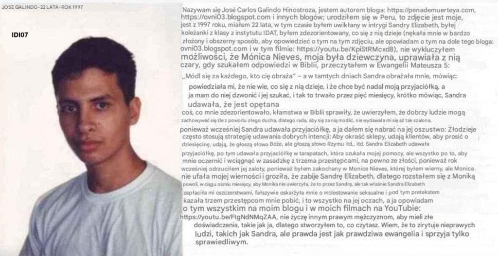 Urodziłem się w Peru. To moje zdjęcie z 1997 roku, kiedy miałem 22 lata. W tamtym czasie byłem uwikłany w intrygi Sandry Elizabeth, byłej koleżanki z instytutu IDAT. Byłem zdezorientowany tym, co się z nią działo (prześladowała mnie w bardzo skomplikowany i rozbudowany sposób, którego nie da się wyjaśnić w tym jednym obrazie, ale opisuję to szczegółowo na dole mojego bloga: ovni03.blogspot.com i w tym filmie: