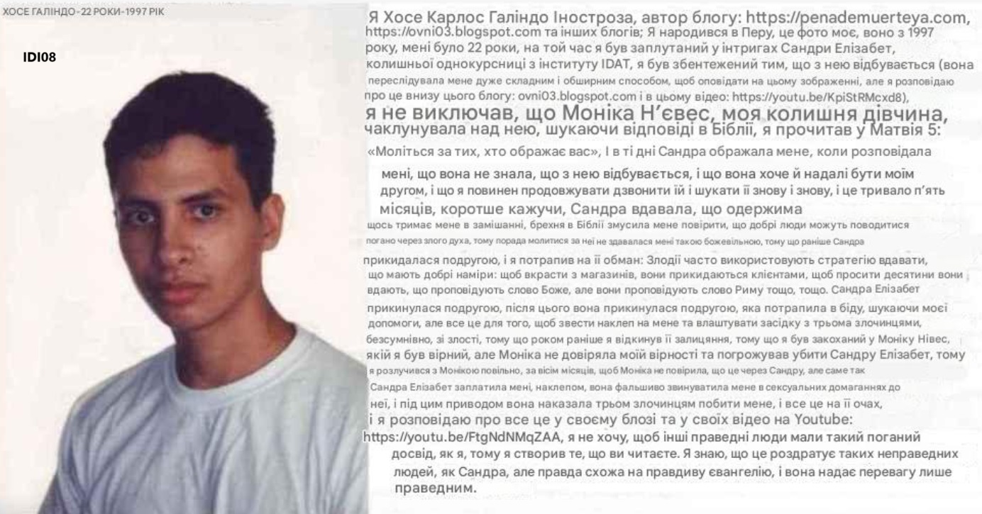 Я народився в Перу. Це моє фото, зроблене у 1997 році, коли мені було 22 роки. У той час я потрапив у павутину інтриг Сандри Елізабет, колишньої однокурсниці з інституту IDAT. Я був збентежений тим, що з нею відбувалося (вона переслідувала мене у дуже складний і тривалий спосіб, який надто довго пояснювати тут, але я розповідаю про це в нижній частині цього блогу: ovni03.blogspot.com та у цьому відео: