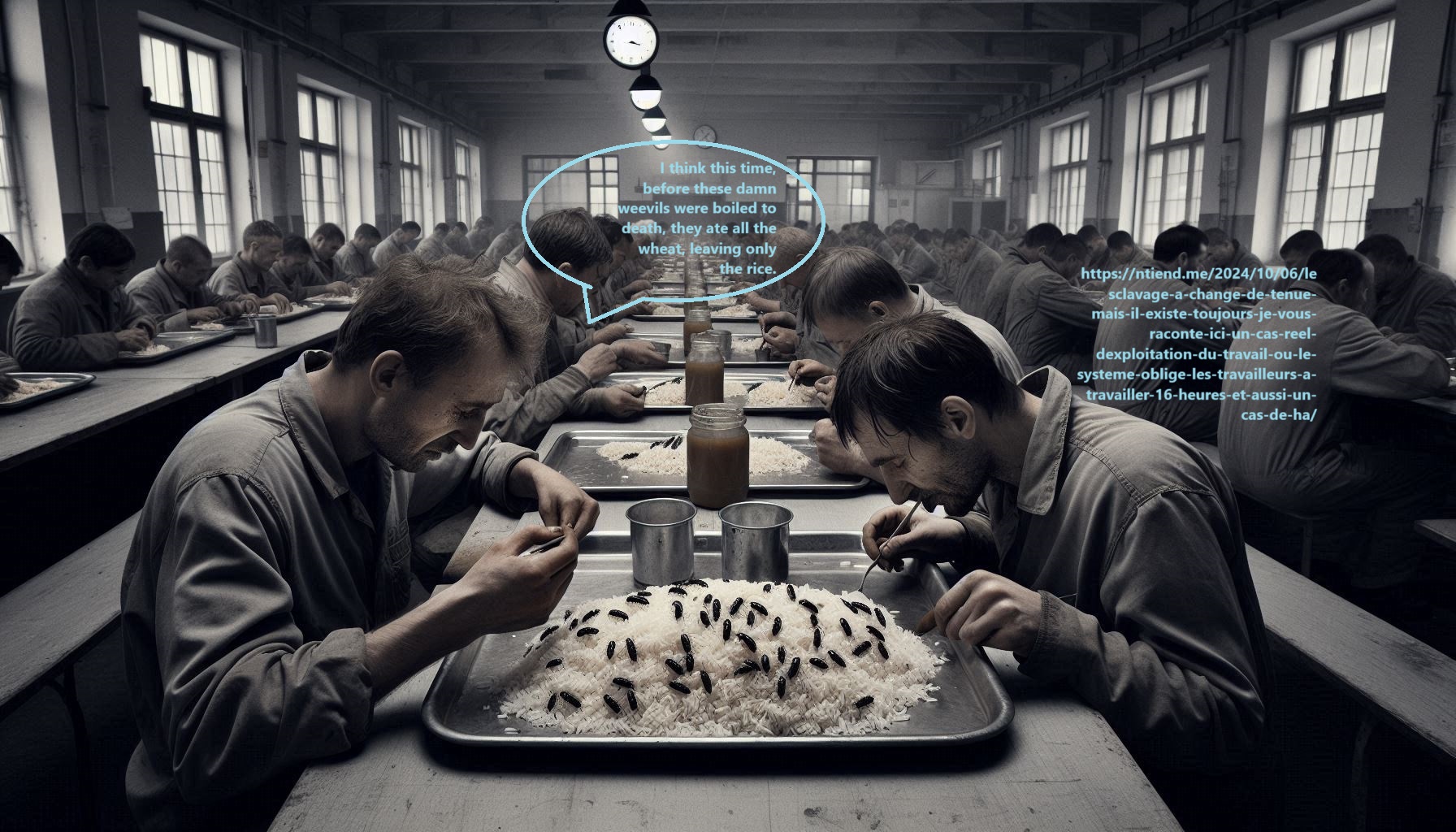 Те, кто там работал, тоже запомнят эту деталь: в обеденное время, частично субсидируемое, которое было в 3 часа дня, нам всю неделю подавали одно и то же: рис с пшеницей, но пшеницу с десятками долгоносиков. Мы должны были отделять пшеницу от долгоносиков, если мы не хотели есть долгоносиков! Также, для того, чтобы мы не уснули тяжелой физической работой, так как наш рабочий день был с 8:00 до 12:00 ночи – 1:30 ночи на следующий день с понедельника по субботу и воскресенье с 8:00 утра до 10:30 вечера, в 8 вечера нам подали горячий кофе в одноразовом стаканчике и две крошечные мини-буханки, которые мы ели стоя у входа на склад.