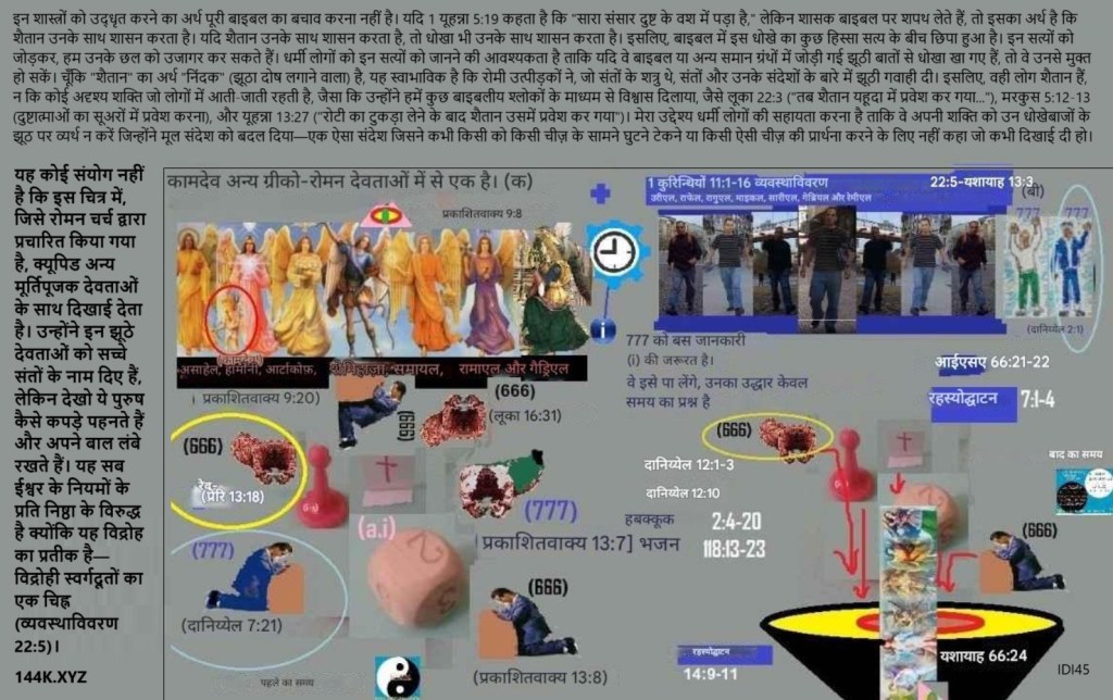 यह कोई संयोग नहीं है कि इस चित्र में, जिसे रोमन चर्च द्वारा प्रचारित किया गया है, क्यूपिड अन्य मूर्तिपूजक देवताओं के साथ दिखाई देता है। उन्होंने इन झूठे देवताओं को सच्चे संतों के नाम दिए हैं, लेकिन देखो ये पुरुष कैसे कपड़े पहनते हैं और अपने बाल लंबे रखते हैं। यह सब ईश्वर के नियमों के प्रति निष्ठा के विरुद्ध है क्योंकि यह विद्रोह का प्रतीक है—विद्रोही स्वर्गदूतों का एक चिह्न (व्यवस्थाविवरण 22:5)।
