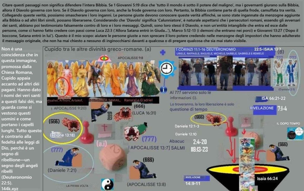 Non è una coincidenza che in questa immagine, promossa dalla Chiesa Romana, Cupido appaia accanto ad altri dèi pagani. Hanno dato i nomi dei veri santi a questi falsi dèi, ma guarda come si vestono questi uomini e come portano i capelli lunghi. Tutto questo è contrario alla fedeltà alle leggi di Dio, perché è un segno di ribellione—un segno degli angeli ribelli (Deuteronomio 22:5).