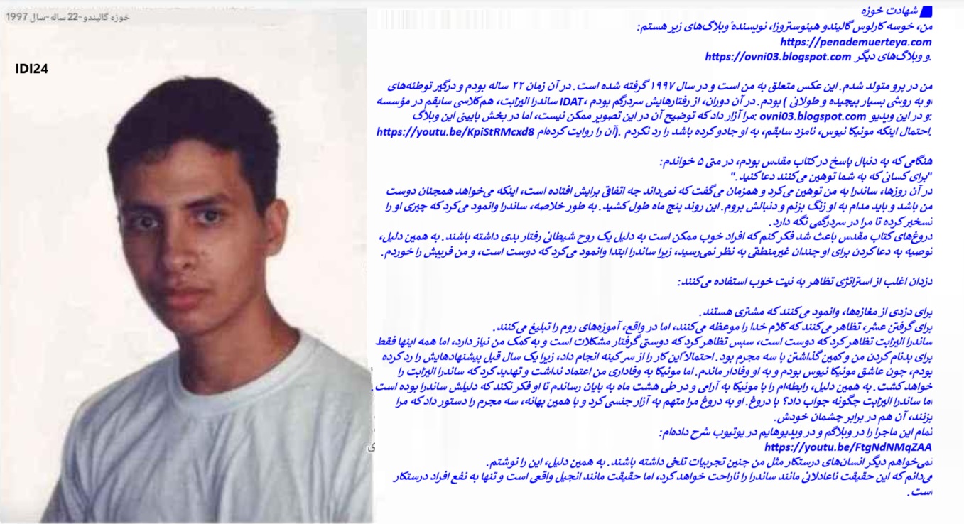 من در پرو متولد شدم. این عکس متعلق به من است و در سال ۱۹۹۷ گرفته شده است. در آن زمان ۲۲ ساله بودم و درگیر توطئههای ساندرا الیزابت، همکلاسی سابقم در مؤسسه IDAT، بودم. در آن دوران، از رفتارهایش سردرگم بودم (او به روشی بسیار پیچیده و طولانی مرا آزار داد که توضیح آن در این تصویر ممکن نیست، اما در بخش پایینی این وبلاگ: ovni03.blogspot.com و در این ویدیو: