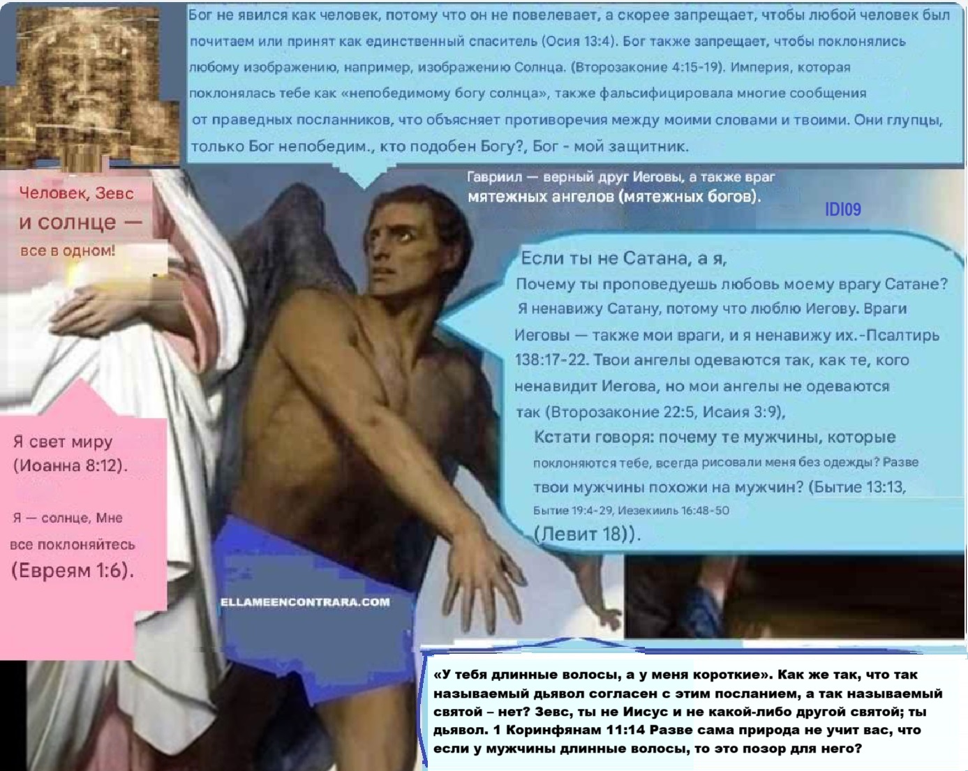Верный друг Иеговы, как и я, сказал бы настоящему дьяволу: «У тебя длинные волосы, а у меня короткие». Как же так, что так называемый дьявол согласен с этим посланием, а так называемый святой – нет? Зевс, ты не Иисус и не какой-либо другой святой; ты дьявол. 1 Коринфянам 11:14 Разве сама природа не учит вас, что если у мужчины длинные волосы, то это позор для него?