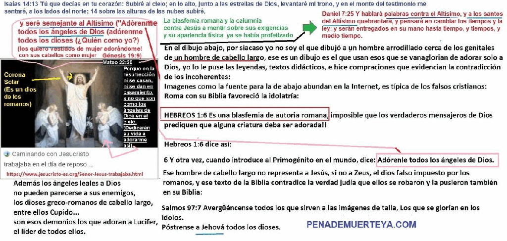 Y ellos dicen también que la verdad es su dios de cabello largo, ese dios Júpiter, el Zeus griego que proclaman con sus imágenes, lo hicieron a través de un evangelio falso que dice de él: «Yo soy la verdad, yo soy la puerta, adórenme a mi todos los dioses (Hebreos 1:6, Juan 14:16)». Era de suponer que esos asesinos odiaban la verdad y por eso engañando falsificaron sus mensajes, y siguiendo engañado dijeron: «Ya no perseguimos esa religión, ahora la difundimos.». Mi «OVNI» NTIEND.ME, emite luz. Esa luz destruye las calumnias del dragón o Satanás, cuyo nombre significa «el calumniador».