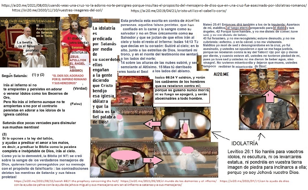 Este es la verdad en la Biblia que destruye la mentira romana en la Biblia: Apocalipsis 19:11 Vi el cielo abierto, y un caballo blanco, y el que lo montaba se llamaba Fiel y Verdadero, y con justicia juzga y hace la guerra. Apocalipsis 19:19 Vi a la bestia, a los reyes de la tierra y a sus ejércitos, reunidos para hacer guerra contra el que montaba el caballo, y contra su ejército. Salmos 2:2-4 dice: “Se levantaron los reyes de la tierra, y los gobernantes consultaron unidos contra el Señor y contra su ungido, diciendo: Rompamos sus ataduras, y echemos de nosotros sus cuerdas”. El que mora en los cielos se ríe; el Señor se burla de ellos”. Ahora, algo de lógica básica: si el jinete lucha por la justicia, pero la bestia y los reyes de la tierra luchan contra este jinete, entonces la bestia y los reyes de la tierra están en contra de la justicia, por lo tanto, representan el engaño de las religiones falsas que gobiernan con ellos. La ramera Babilonia, que es la iglesia falsa hecha por Roma, se ha considerado a sí misma como «la esposa del ungido del Señor», pero los falsos profetas de esta organización vendedora de ídolos y palabras aduladoras, no comparten las metas personales del ungido del Señor y de los verdaderos santos, porque los líderes impíos han escogido para sí mismos el camino de la idolatría, el celibato o el sacramentar matrimonios no sagrado a cambio de dinero. Su sedes religiosas están llenas de ídolos, incluyendo los falsos libros sagrados, delante de los cuales se arrodillan: Isaías 2:8 Además su tierra está llena de ídolos, y se han arrodillado ante la obra de sus manos y ante lo que fabricaron sus dedos. 9 Y se ha inclinado el hombre, y el varón se ha humillado; por tanto, no los perdones. 10 Métete en la peña, escóndete en el polvo, de la presencia temible de Jehová, y del resplandor de su majestad. 11 La altivez de los ojos del hombre será abatida, y la soberbia de los hombres será humillada; y Jehová solo será exaltado en aquel día. Proverbios 19:14 La casa y las riquezas son herencia de los padres, pero la mujer prudente es de Jehová. Levítico 21:14 El sacerdote de Jehová no se casará con viuda, ni repudiada, ni inmunda, ni ramera; tomará por mujer a una virgen de su pueblo. Apocalipsis 1:6 Y nos ha hecho reyes y sacerdotes para Dios, su Padre; a él sea la gloria y el imperio por los siglos. 1 Corintios 11:7 La mujer es gloria del varón. No soy fanático religioso, entre otras razones, porque no sigo ninguna religión conocida. Yo sigo la justicia. Mi pasión es la justicia. Soy el creador de blogs como lavirgenmecreera.com, y el nombre del dominio (La virgen me creerá) no tiene nada que ver con lo que creen algunos prejuiciosos. No soy católico ni me refiero a la mujer que ellos llaman «la virgen». Tampoco soy evangelista bíblico, porque no defiendo la Biblia. Por el contrario, mis mensajes son incompatibles con los pensamientos de los fanáticos religiosos. El típico fanático religioso es incapaz de admitir que hay mentiras en la Biblia, el Corán o la Torá. A pesar de las contradicciones evidentes, se niegan a aceptar que el Imperio Romano, al perseguir la verdadera religión, la destruyó completamente y nunca permitió su reconstrucción. Las actuales religiones que dicen adorar al Dios de Abraham no son más que remedos acomodados a los intereses de Roma. Por eso sus líderes se llevan tan bien y se abrazan fraternalmente en reuniones interreligiosas. Cualquiera que tenga un mínimo de lógica puede notar que algo no cuadra ahí. «No puede ser cierto que todos los caminos de esas religiones conduzcan a Dios.» Es simple razonamiento: si A dice «x = 1», B dice «x = 2» y C dice «x = 3», luego todos juntos afirman: «Todas nuestras creencias son correctas y complacen a un mismo Dios», ¿Qué se puede concluir? Salvo que seas un imbécil, es evidente que todas sus afirmaciones son falsas. Si una fuera correcta, su portavoz no se llevaría bien con los voceros de las otras dos ni estarían repartiéndose abrazos y besos. Pero entre estafadores siempre hay acuerdos para repartirse influencias, y muchos políticos, al jurar sus cargos con la mano sobre sus «libros sagrados», dejan claro a quién sirven realmente.