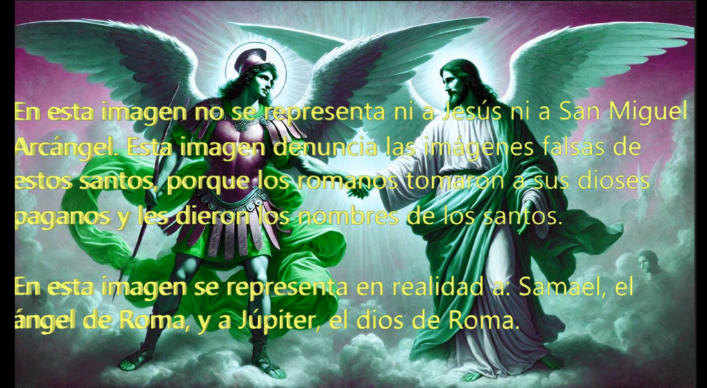 En esta imagen no se representa ni a Jesús ni a San Miguel Arcángel. Esta imagen denuncia las imágenes falsas de estos santos, porque los romanos tomaron a sus dioses paganos y les dieron los nombres de los santos.