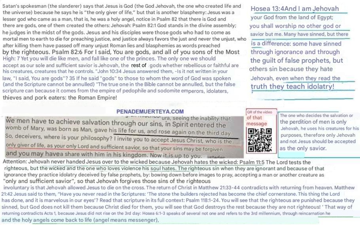 Ci imbecyle twierdzą, że mogą czynić złe uczynki, ale wystarczy im powiedzieć, że przyjmują długowłosego mężczyznę o wyglądzie greckiego boga, jako swojego jedynego pana i wystarczającego zbawiciela, aby z kolei uwolnić się od kary Bożej, twierdzą, że jeśli ktoś wykonuje sprawiedliwe uczynki, ale nie akceptuje tego długowłosego mężczyzny jako swojego jedynego pana i wystarczającego zbawiciela, jest pod gniewem Boga, którego boga?Tym fałszywym Bogiem musi być Lucyfer, oburzony na tych, którzy nie czcijcie go, ale Sprawiedliwi nie czczą ani nie akceptują żadnego stworzenia jako wystarczającego zbawiciela, ale tylko Stwórcę Wszechświata, Jehowę! Ozeasza 13:4 Nie będą czcić żadnego Zbawiciela poza Jehową.