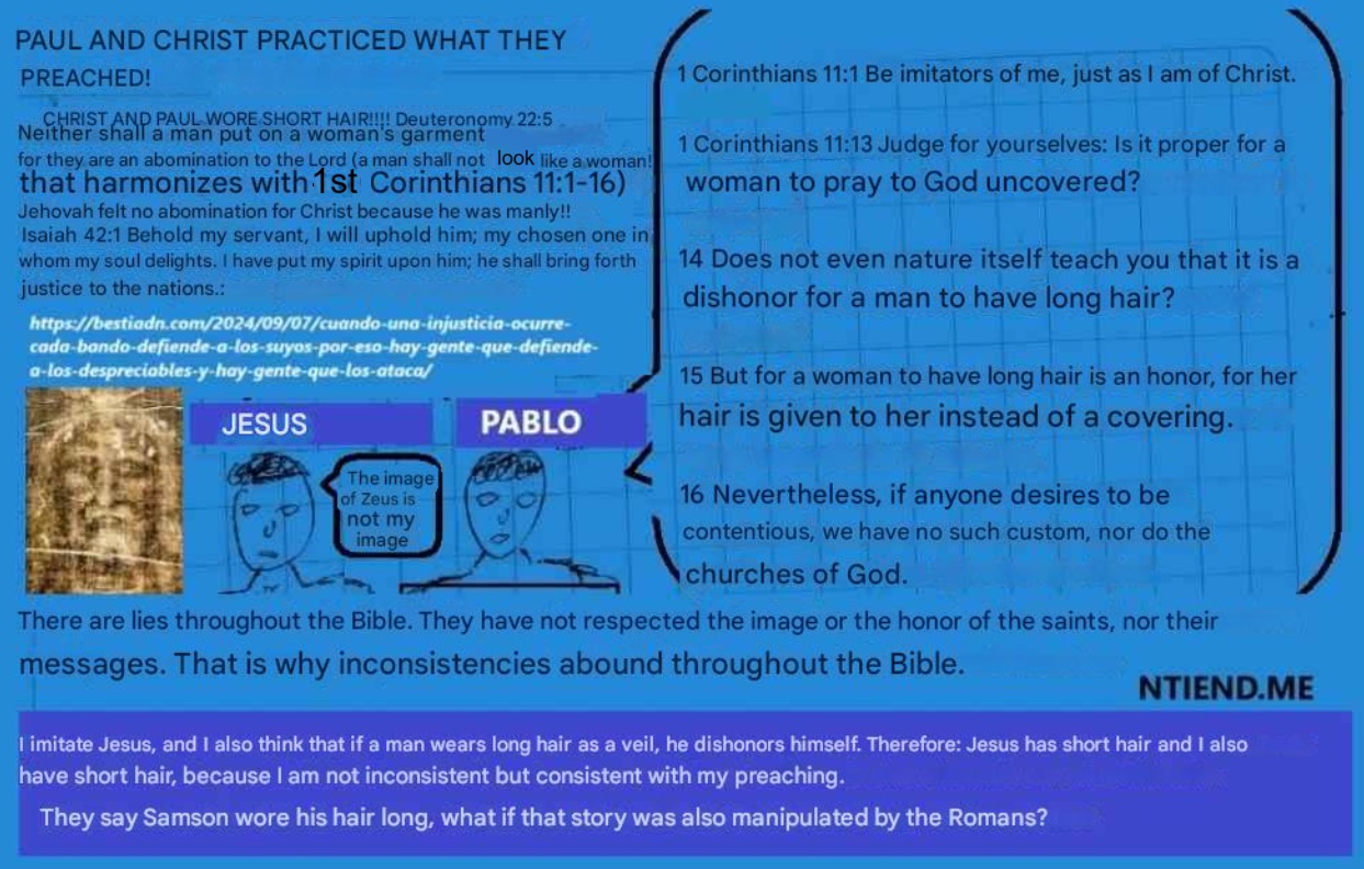 1 List do Koryntian 11:14 Czyż sama natura rzeczy nie uczy was, że jeśli ktoś ma długie włosy, jest to dla niego hańbą? 15 A jeśli kobieta ma długie włosy, to jest jej chwała? Bo długie włosy są jej dane jako okrycie.