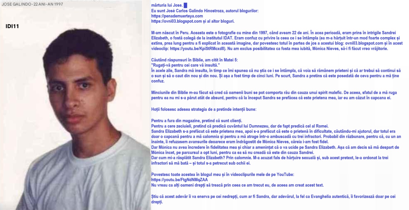M-am născut în Peru. Aceasta este o fotografie cu mine din 1997, când aveam 22 de ani. În acea perioadă, eram prins în intrigile Sandrei Elizabeth, o fostă colegă de la institutul IDAT. Eram confuz cu privire la ceea ce i se întâmpla (ea m-a hărțuit într-un mod foarte complex și extins, prea lung pentru a fi explicat în această imagine, dar povestesc totul în partea de jos a acestui blog: ovni03.blogspot.com și în acest videoclip: