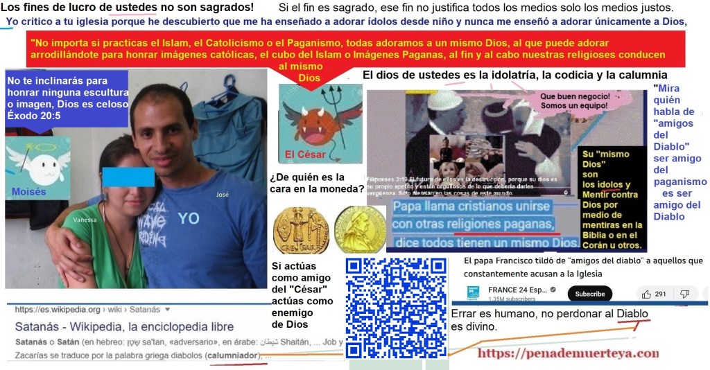 “¿Quién es responsable de la maldad, “”Satanás”” o la persona que comete la maldad? No te dejes engañar por justificaciones estúpidas porque “”el Diablo”” al que culpan de sus propias malas acciones en realidad son ellos mismos. La típica excusa de la persona religiosa perversa: “”Yo no soy así porque no soy yo quien hace este mal, sino el Diablo que me ha poseído quien hace este mal.”” Los romanos, actuando como “”Satanás””, crearon contenido que también hicieron pasar por leyes de Moisés, contenido injusto para desacreditar el contenido justo: La Biblia no solo contiene verdades, también contiene mentiras. Satanás es un ser de carne y hueso porque significa: el calumniador. Los romanos calumniaron a Pablo atribuyéndole la autoría del mensaje de Efesios 6:12. La lucha es contra carne y sangre. Números 35:33 menciona la pena de muerte contra carne y sangre, los ángeles enviados por Dios a Sodoma destruyeron carne y sangre, y no “”huestes espirituales de maldad en las regiones celestiales.”” Mateo 23:15 dice que los fariseos convierten a sus seguidores en personas aún más corruptas que ellos, sugiriendo que alguien puede volverse injusto por influencia externa. En cambio, Daniel 12:10 dice que los injustos seguirán actuando con injusticia porque es su naturaleza, y solo los justos comprenderán el camino de la justicia. La falta de armonía entre estos dos mensajes muestra que algunas partes de la Biblia entran en contradicción, lo que pone en duda su veracidad absoluta. https://naodanxxii.wordpress.com/wp-content/uploads/2025/03/idi02-the-plot.pdf .” “El imperio Romano, Bahira, Mahoma, Jesús y el judaísmo perseguido. El nacimiento y la muerte de cuarta bestia. La alianza greco-romana por los mismos dioses. El Imperio seléucida. Cuidado con creer en el evangelio del anticristo (Buenas noticias para los injustos, aunque falsas) Si quieres salvarte del engaño del adversario de la justicia, considera que: Para rechazar el falso evangelio de Roma, acepte que si Jesús fue justo entonces no amó a sus enemigos, y si no fue hipócrita entonces no predicó el amor a los enemigos porque no predicaba lo que no practicaba: Proverbios 29:27 Los justos odian a los injustos, y los injustos odian a los justos. Esto es parte del evangelio adulterado por los romanos para la Biblia: 1 Pedro 3:18 Porque Cristo murió una vez por los pecados, el justo por los injustos, para llevarnos a Dios. Ahora mire esto que desmiente esa calumnia: Salmo 118:20 Esta es la puerta de Jehová; los justos entrarán por ella. 21 Te daré gracias porque me has escuchado y has sido mi salvación. 22 La piedra que rechazaron los constructores se ha convertido en la piedra angular. Jesús maldice a sus enemigos en la parábola que predice su muerte y regreso: Lucas 20:14 Pero cuando los viñadores vieron esto, discutieron entre sí, diciendo: Éste es el heredero; Venid, matémoslo, para que la herencia sea nuestra. 15 Entonces lo echaron de la viña y lo mataron. ¿Qué les hará entonces el dueño de la viña? 16 Él vendrá y destruirá a estos viñadores y dará la viña a otros. Cuando lo oyeron, dijeron: ¡De ninguna manera! 17 Pero Jesús, mirándolos, dijo: ¿Qué, pues, es esto que está escrito: La piedra que desecharon los constructores se ha convertido en la piedra angular? Él habló de esta piedra, de la piedra de la pesadilla del rey de Babilonia: Daniel 2:31 Tú, oh rey, veías, y he aquí una gran imagen. Esta imagen, que era muy grande, y cuya gloria era muy sublime, estaba en pie delante de ti, y su aspecto era terrible. 32 La cabeza de esta imagen era de oro fino; su pecho y sus brazos, de plata; su vientre y sus muslos, de bronce; 33 sus piernas, de hierro; sus pies, en parte de hierro y en parte de barro cocido. 34 Estabas mirando, hasta que una piedra fue cortada, no con mano, e hirió a la imagen en sus pies de hierro y de barro cocido, y los desmenuzó. 35 Entonces fueron desmenuzados también el hierro, el barro cocido, el bronce, la plata y el oro, y fueron como tamo de las eras del verano, y se los llevó el viento sin que de ellos quedara rastro alguno. Mas la piedra que hirió a la imagen fue hecha un gran monte que llenó toda la tierra. La cuarta bestia es la alianza de los líderes de todas las falsas religiones amigables con el fraude romano denunciado. El Cristianismo y el Islam dominan el mundo, la mayoría de los gobiernos o juran por el Corán o por la Biblia, por ese simple motivo, aunque los gobiernos lo nieguen, son gobiernos religiosos que se someten a las autoridades religiosas que están detrás de esos libros por los cuales juraron. Aquí les voy a mostrar la influencia romana en los dogmas de estas religiones y como distan mucho de los dogmas de la religión que perseguía Roma, Además, lo que les voy a mostrar no es parte de la religión que hoy se conoce como Judaísmo. Y si a esto le sumamos la fraternidad de los líderes del Judaísmo, Cristianismo e Islam, hay suficientes elementos para señalar a Roma como la creadora de los dogmas de estas religiones, y que la última religión mencionada no es la misma que el Judaísmo que perseguía Roma. Sí, estoy afirmando que Roma creó el cristianismo y que persiguió un Judaísmo diferente al actual, los líderes leales del Judaísmo legítimo jamás darían abrazos fraternales a difusores de doctrinas idólatras. Es evidente que no soy cristiano, ¿entonces porque cito pasajes de la Biblia para dar sustento a lo que digo?, pues porque no todo en la Biblia pertenece exclusivamente al cristianismo, parte de su contenido es el contenido de la religión del camino de la justicia que fue perseguido por el imperio romano por ser contrario al ideal romano de hacer que «Todos los caminos conduzcan a Roma (Es decir, que esos caminos favorezcan los intereses imperiales), por eso tomo algunos pasajes de la Biblia para sustentar mis afirmaciones. Daniel 2:40 Y el cuarto reino
