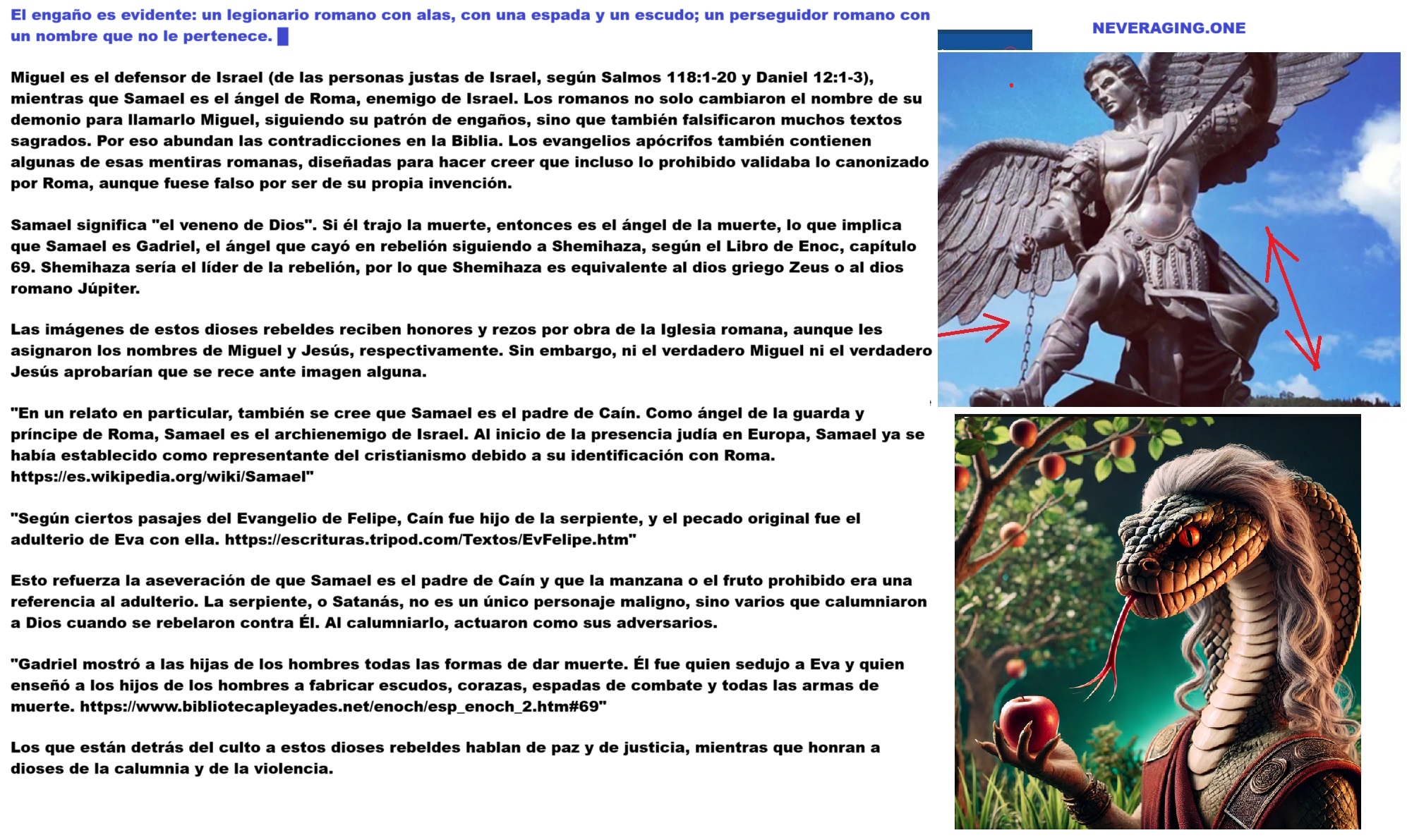 Cometí el error de defender la fe en la Biblia, pero por ignorancia. Sin embargo, ahora veo que no es el libro guía de la religión que Roma persiguió, sino de la que creó para complacerse con el celibato. Por eso predicaron un Cristo que no se casa con una mujer, sino con su iglesia, y ángeles que, a pesar de tener nombres masculinos, no parecen hombres (saca tus propias conclusiones). Estas figuras son afines a los falsos santos, besadores de estatuas de yeso, y similares a los dioses grecorromanos, porque, en realidad, son esos mismos dioses paganos con otros nombres.