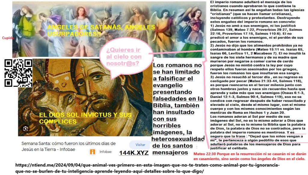 El juego de contrastes resalta cómo los artistas religiosos —especialmente bajo influencia romana y renacentista— moldearon a los “ángeles” según su estética e ideología, no según la Biblia. Es una manera fuerte y efectiva de decir: “Esto no es un ángel fiel a Dios, es una farsa artística impuesta por Roma”.