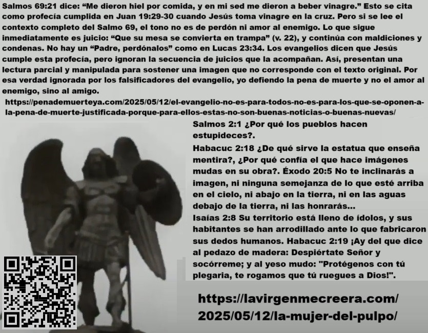 Salmos 69:21 dice: “Me dieron hiel por comida, y en mi sed me dieron a beber vinagre.” Esto se cita como profecía cumplida en Juan 19:29-30 cuando Jesús toma vinagre en la cruz. Pero si se lee el contexto completo del Salmo 69, el tono no es de perdón ni amor al enemigo. Lo que sigue inmediatamente es juicio: “Que su mesa se convierta en trampa” (v. 22), y continúa con maldiciones y condenas. No hay un “Padre, perdónalos” como en Lucas 23:34. Los evangelios dicen que Jesús cumple esta profecía, pero ignoran la secuencia de juicios que la acompañan. Así, presentan una lectura parcial y manipulada para sostener una imagen que no corresponde con el texto original. Por esa verdad ignorada por los falsificadores del evangelio, yo defiendo la pena de muerte y no el amor al enemigo, sino al amigo.