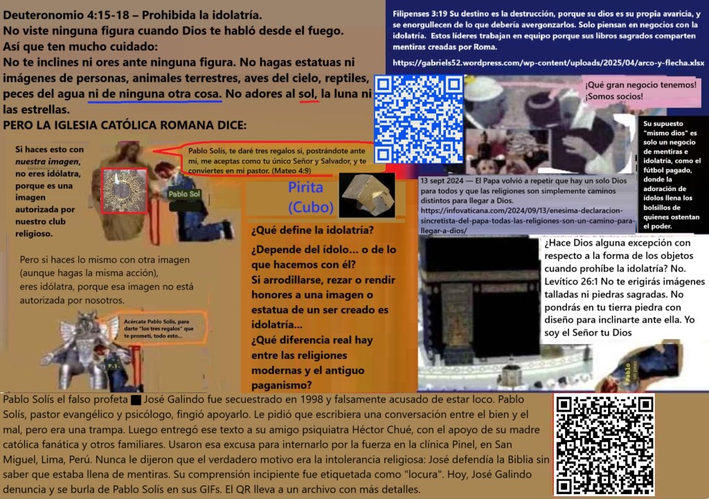 “¿Quién es responsable de la maldad, “”Satanás”” o la persona que comete la maldad? No te dejes engañar por justificaciones estúpidas porque “”el Diablo”” al que culpan de sus propias malas acciones en realidad son ellos mismos. La típica excusa de la persona religiosa perversa: “”Yo no soy así porque no soy yo quien hace este mal, sino el Diablo que me ha poseído quien hace este mal.”” Los romanos, actuando como “”Satanás””, crearon contenido que también hicieron pasar por leyes de Moisés, contenido injusto para desacreditar el contenido justo: La Biblia no solo contiene verdades, también contiene mentiras. Satanás es un ser de carne y hueso porque significa: el calumniador. Los romanos calumniaron a Pablo atribuyéndole la autoría del mensaje de Efesios 6:12. La lucha es contra carne y sangre. Números 35:33 menciona la pena de muerte contra carne y sangre, los ángeles enviados por Dios a Sodoma destruyeron carne y sangre, y no “”huestes espirituales de maldad en las regiones celestiales.”” Mateo 23:15 dice que los fariseos convierten a sus seguidores en personas aún más corruptas que ellos, sugiriendo que alguien puede volverse injusto por influencia externa. En cambio, Daniel 12:10 dice que los injustos seguirán actuando con injusticia porque es su naturaleza, y solo los justos comprenderán el camino de la justicia. La falta de armonía entre estos dos mensajes muestra que algunas partes de la Biblia entran en contradicción, lo que pone en duda su veracidad absoluta. https://naodanxxii.wordpress.com/wp-content/uploads/2025/03/idi02-the-plot.pdf .” “El imperio Romano, Bahira, Mahoma, Jesús y el judaísmo perseguido. El nacimiento y la muerte de cuarta bestia. La alianza greco-romana por los mismos dioses. El Imperio seléucida. Cuidado con creer en el evangelio del anticristo (Buenas noticias para los injustos, aunque falsas) Si quieres salvarte del engaño del adversario de la justicia, considera que: Para rechazar el falso evangelio de Roma, acepte que si Jesús fue justo entonces no amó a sus enemigos, y si no fue hipócrita entonces no predicó el amor a los enemigos porque no predicaba lo que no practicaba: Proverbios 29:27 Los justos odian a los injustos, y los injustos odian a los justos. Esto es parte del evangelio adulterado por los romanos para la Biblia: 1 Pedro 3:18 Porque Cristo murió una vez por los pecados, el justo por los injustos, para llevarnos a Dios. Ahora mire esto que desmiente esa calumnia: Salmo 118:20 Esta es la puerta de Jehová; los justos entrarán por ella. 21 Te daré gracias porque me has escuchado y has sido mi salvación. 22 La piedra que rechazaron los constructores se ha convertido en la piedra angular. Jesús maldice a sus enemigos en la parábola que predice su muerte y regreso: Lucas 20:14 Pero cuando los viñadores vieron esto, discutieron entre sí, diciendo: Éste es el heredero; Venid, matémoslo, para que la herencia sea nuestra. 15 Entonces lo echaron de la viña y lo mataron. ¿Qué les hará entonces el dueño de la viña? 16 Él vendrá y destruirá a estos viñadores y dará la viña a otros. Cuando lo oyeron, dijeron: ¡De ninguna manera! 17 Pero Jesús, mirándolos, dijo: ¿Qué, pues, es esto que está escrito: La piedra que desecharon los constructores se ha convertido en la piedra angular? Él habló de esta piedra, de la piedra de la pesadilla del rey de Babilonia: Daniel 2:31 Tú, oh rey, veías, y he aquí una gran imagen. Esta imagen, que era muy grande, y cuya gloria era muy sublime, estaba en pie delante de ti, y su aspecto era terrible. 32 La cabeza de esta imagen era de oro fino; su pecho y sus brazos, de plata; su vientre y sus muslos, de bronce; 33 sus piernas, de hierro; sus pies, en parte de hierro y en parte de barro cocido. 34 Estabas mirando, hasta que una piedra fue cortada, no con mano, e hirió a la imagen en sus pies de hierro y de barro cocido, y los desmenuzó. 35 Entonces fueron desmenuzados también el hierro, el barro cocido, el bronce, la plata y el oro, y fueron como tamo de las eras del verano, y se los llevó el viento sin que de ellos quedara rastro alguno. Mas la piedra que hirió a la imagen fue hecha un gran monte que llenó toda la tierra. La cuarta bestia es la alianza de los líderes de todas las falsas religiones amigables con el fraude romano denunciado. El Cristianismo y el Islam dominan el mundo, la mayoría de los gobiernos o juran por el Corán o por la Biblia, por ese simple motivo, aunque los gobiernos lo nieguen, son gobiernos religiosos que se someten a las autoridades religiosas que están detrás de esos libros por los cuales juraron. Aquí les voy a mostrar la influencia romana en los dogmas de estas religiones y como distan mucho de los dogmas de la religión que perseguía Roma, Además, lo que les voy a mostrar no es parte de la religión que hoy se conoce como Judaísmo. Y si a esto le sumamos la fraternidad de los líderes del Judaísmo, Cristianismo e Islam, hay suficientes elementos para señalar a Roma como la creadora de los dogmas de estas religiones, y que la última religión mencionada no es la misma que el Judaísmo que perseguía Roma. Sí, estoy afirmando que Roma creó el cristianismo y que persiguió un Judaísmo diferente al actual, los líderes leales del Judaísmo legítimo jamás darían abrazos fraternales a difusores de doctrinas idólatras. Es evidente que no soy cristiano, ¿entonces porque cito pasajes de la Biblia para dar sustento a lo que digo?, pues porque no todo en la Biblia pertenece exclusivamente al cristianismo, parte de su contenido es el contenido de la religión del camino de la justicia que fue perseguido por el imperio romano por ser contrario al ideal romano de hacer que «Todos los caminos conduzcan a Roma (Es decir, que esos caminos favorezcan los intereses imperiales), por eso tomo algunos pasajes de la Biblia para sustentar mis afirmaciones. Daniel 2:40 Y el cuarto reino