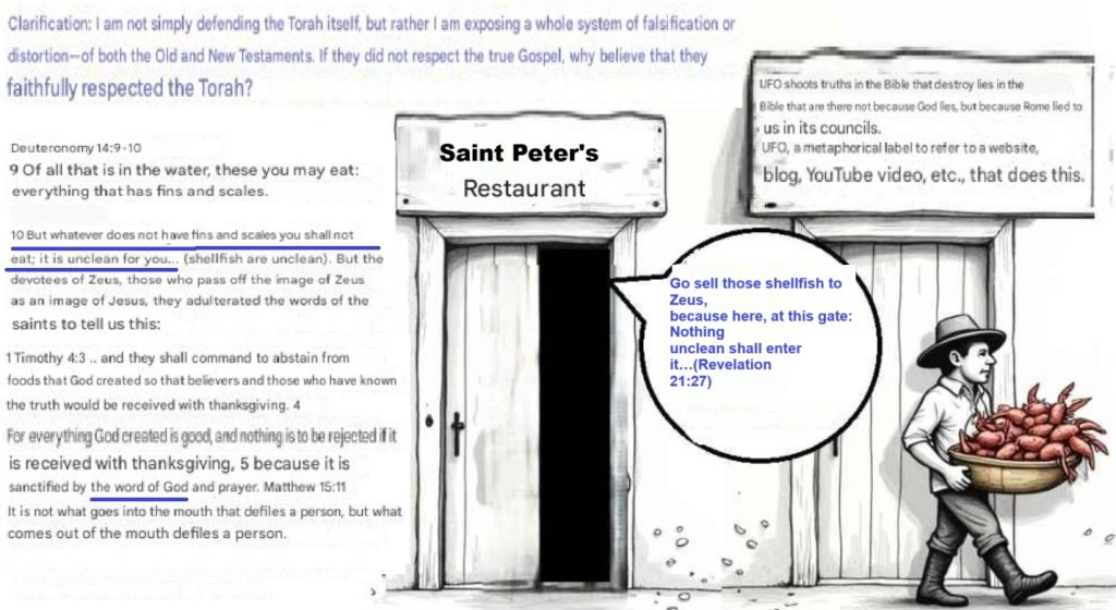 You know that part of your rebellion was corrupting righteous words to include in the diet things you falsely claimed were approved by our Creator—some insects, shellfish, pork, and other unclean foods—just to please those who worship your image and love your dietary laws! And you know this is your saying: “”Nothing that enters a man’s mouth defiles him”” (Matthew 15:11). And with these deceptions, you have led my people into sin against our Creator.