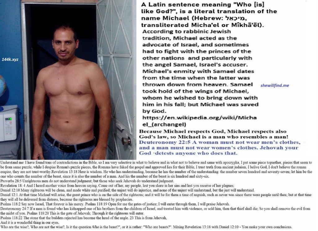 https://144k.xyz/wp-content/uploads/2025/03/idi02-she-will-find-me-the-virgin-will-believe-me.docx She will find me, the virgin woman will believe me. ( https://ellameencontrara.com – https://lavirgenmecreera.com – https://shewillfind.me ) This is the wheat in the Bible that destroys the Roman tares in the Bible: Revelation 19:11 Then I saw heaven opened, and there was a white horse; and the one sitting on it was called Faithful and True, and in righteousness, he judges and makes war. Revelation 19:19 Then I saw the beast, and the kings of the earth, and their armies gathered together to make war against the one sitting on the horse and against his army. Psalm 2:2-4 “”The kings of the earth set themselves up, and the rulers took counsel together against the Lord and against his anointed, saying: ‘Let us break their bonds apart and cast away their cords from us.’ He who sits in the heavens laughs; the Lord mocks them.”” Now, some basic logic: if the horseman fights for justice, but the beast and the kings of the earth fight against this horseman, then the beast and the kings of the earth are against justice. Therefore, they represent the deception of the false religions that rule with them. The whore of Babylon, which is the false church made by Rome, has considered herself to be “”the wife of the Lord’s anointed,”” but the false prophets of this idol-selling and flattering word-peddling organization do not share the personal goals of the Lord’s anointed and the true saints, because the ungodly leaders have chosen for themselves the path of idolatry, celibacy, or sacramentalizing unholy marriages in exchange for money. Their religious headquarters are full of idols, including false holy books, before which they bow down: Isaiah 2:8-11 8 Their land is full of idols; they bow down to the work of their hands, to what their fingers have made. 9 So the man is humbled, and the man is brought low; do not forgive them. 10 Go into the rock, hide yourself in the dust from the terror of the LORD and from the splendor of his majesty. 11 The arrogance of human eyes will be brought low, and the pride of men will be humbled; the LORD alone will be exalted on that day. Proverbs 19:14 House and wealth are an inheritance from fathers, but a prudent wife is from the LORD. Leviticus 21:14 The priest of the LORD shall not marry a widow, nor a divorced woman, nor an unclean woman, nor a harlot; he shall take a virgin from his own people as a wife. Revelation 1:6 And he has made us kings and priests to his God and Father; to him be glory and dominion forever. 1 Corinthians 11:7 The woman is the glory of man. What does it mean in Revelation that the beast and the kings of the earth wage war on the rider of the white horse and his army? The meaning is clear, the world leaders are hand in glove with the false prophets who are disseminators of the false religions that are dominant among the kingdoms of the earth, for obvious reasons, that includes Christianity, Islam, etc. These rulers are against justice and truth, which are the values defended by the rider of the white horse and his army loyal to God. As is evident, the deception is part of the false sacred books that these accomplices defend with the label of “Authorized Books of Authorized Religions”, but the only religion that I defend is justice, I defend the right of the righteous not to be deceived with religious deceptions. Revelation 19:19 Then I saw the beast and the kings of the earth and their armies gathered together to make war against the rider on the horse and against his army. Now some basic logic, if the horseman stands for justice, but the beast and the kings of the earth fight against this horseman, then the beast and the kings of the earth are against justice, therefore they stand for the deception of the false religions that rule with them.Un duro golpe de realidad es a «Babilonia» la «resurrección» de los justos, que es a su vez la reencarnación de Israel en el tercer milenio: La verdad no destruye a todos, la verdad no duele a todos, la verdad no incomoda a todos: Israel, la verdad, nada más que la verdad, la verdad que duele, la verdad que incomoda, verdades que duelen, verdades que atormentan, verdades que destruyen.This is my story: José, a young man raised in Catholic teachings, experienced a series of events marked by complex relationships and manipulations. At 19, he began a relationship with Monica, a possessive and jealous woman. Although Jose felt that he should end the relationship, his religious upbringing led him to try to change her with love. However, Monica’s jealousy intensified, especially towards Sandra, a classmate who was making advances on Jose.