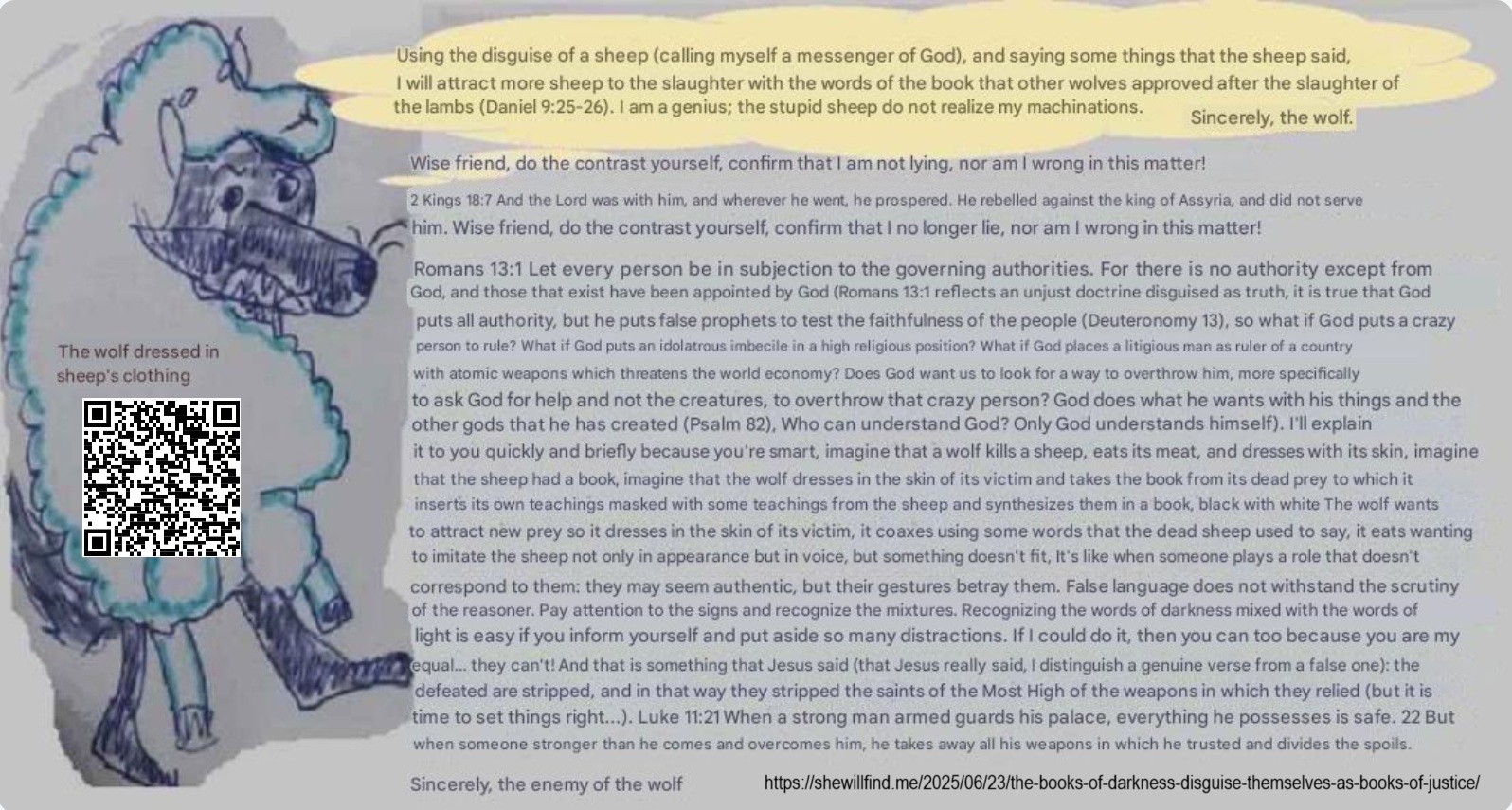 Gloss : This includes calling a book blessed, created, or corrupted by the Roman Empire the “Word of Jehovah,” “Sacred Book,” “Word of God,” “Holy Word,” or “Absolute Truth,” as well as claiming that “if it contradicts what that book says, it is not true.” This inversion of truth and lies is precisely what this passage denounces.