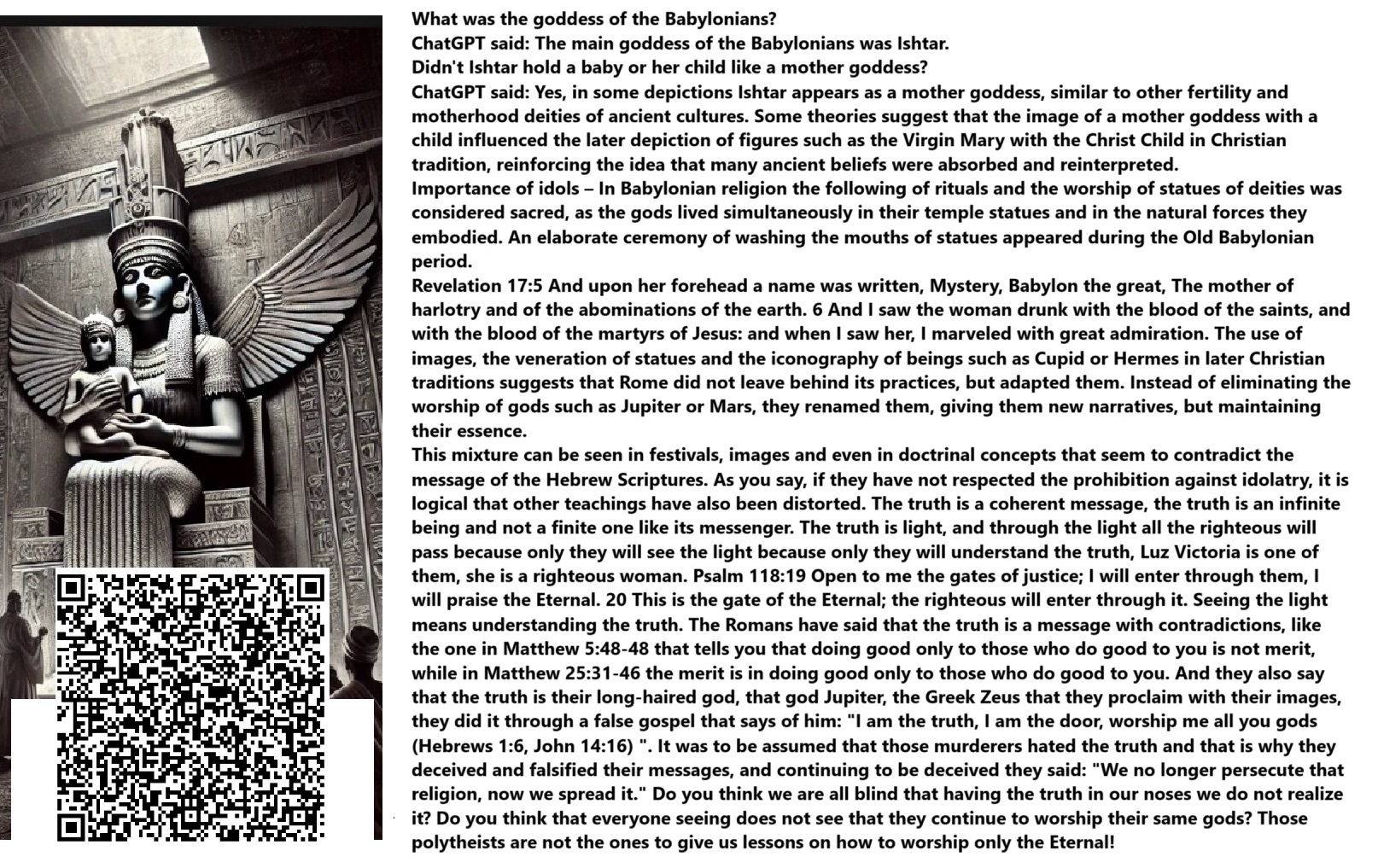 I made the mistake of defending the faith in the Bible, but out of ignorance. However, now I see that it is not the guiding book of the religion that Rome persecuted, but of the one it created to please itself with celibacy. That’s why they preached a Christ who doesn’t marry a woman, but rather His church, and angels who, despite having male names, do not look like men (draw your own conclusions). These figures are akin to the false saints—plaster-statue kissers—and similar to the Greco-Roman gods because, in fact, they are the same pagan gods under different names.