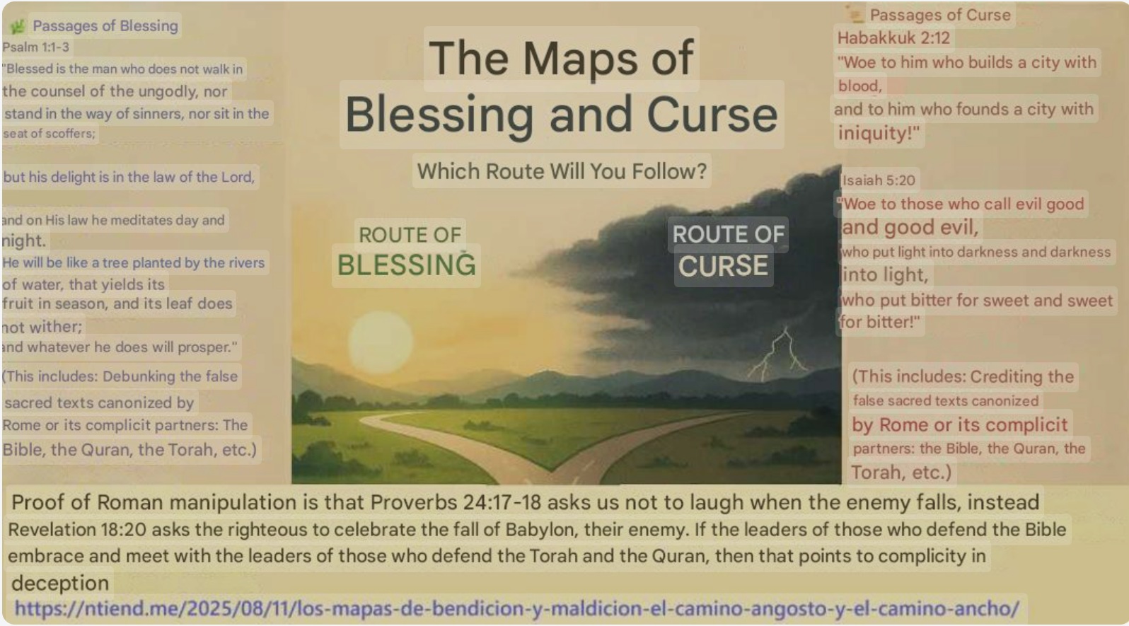 Proof of Roman manipulation is that Proverbs 24:17-18 tells us not to laugh when the enemy falls, while Revelation 18:20 tells the righteous to celebrate the fall of Babylon, their enemy. If the leaders of those who defend the Bible embrace and meet with the leaders of those who defend the Torah and the Quran, then this indicates complicity in deception.