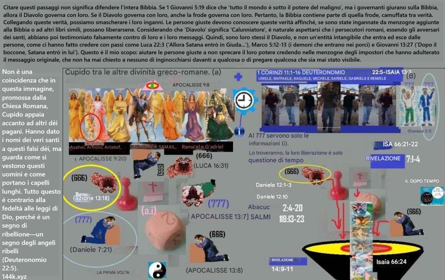 Citare questi passi non significa difendere tutta la Bibbia. Se 1 Giovanni 5:19 dice che “tutto il mondo giace sotto il potere del maligno”, ma i governanti giurano sulla Bibbia, allora il Diavolo governa con loro. Se il Diavolo governa con loro, allora anche l’inganno governa con loro. Quindi, la Bibbia contiene parte di quell’inganno, camuffato tra verità. Collegando queste verità, possiamo smascherare i loro inganni. I giusti devono conoscere queste verità affinché, se sono stati ingannati da menzogne aggiunte alla Bibbia o ad altri libri simili, possano liberarsene.