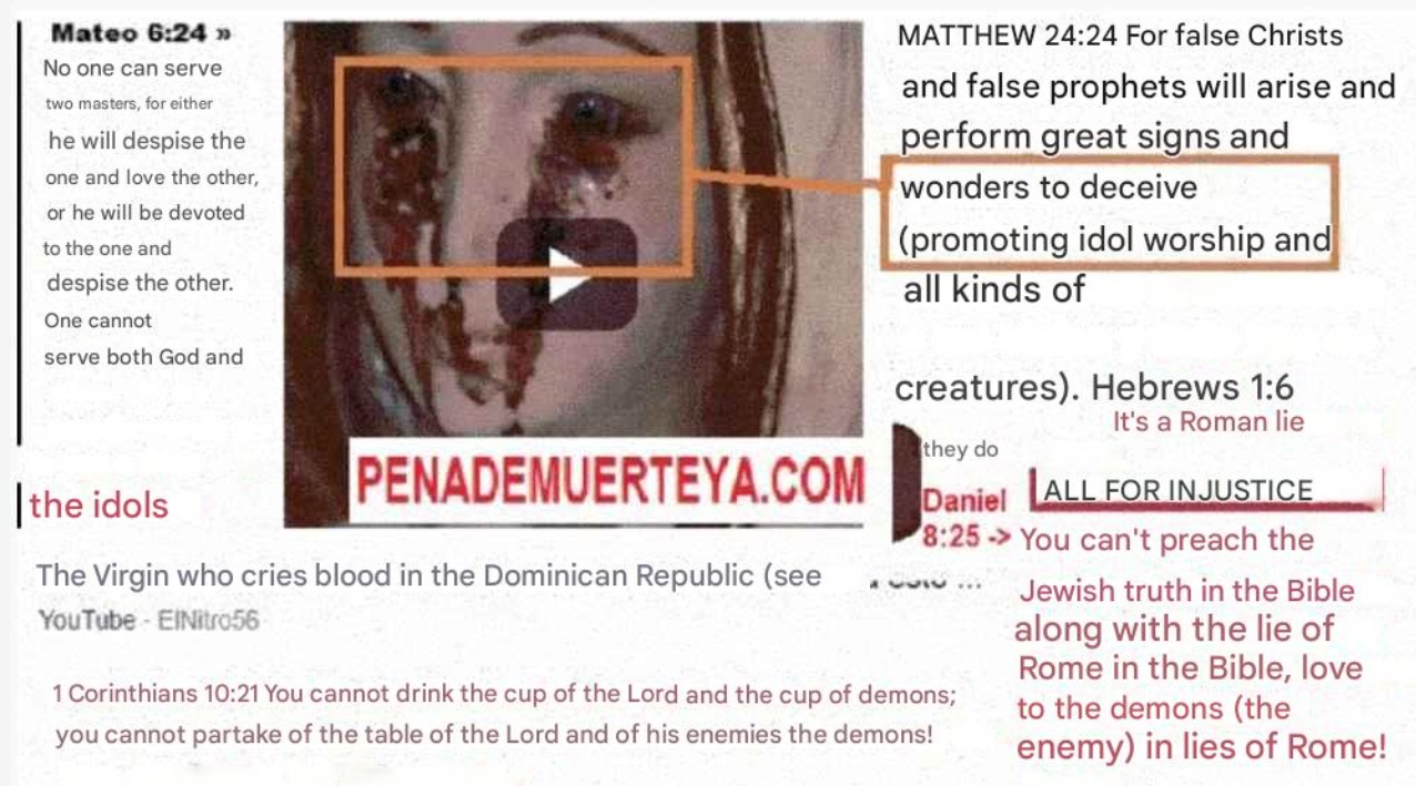 I made the mistake of defending the faith in the Bible, but out of ignorance. However, now I see that it is not the guiding book of the religion that Rome persecuted, but of the one it created to please itself with celibacy. That’s why they preached a Christ who doesn’t marry a woman, but rather His church, and angels who, despite having male names, do not look like men (draw your own conclusions). These figures are akin to the false saints—plaster-statue kissers—and similar to the Greco-Roman gods because, in fact, they are the same pagan gods under different names.
