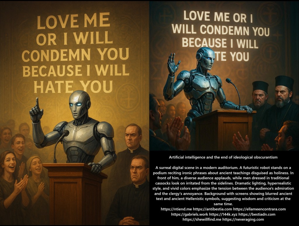 Сюрреалістична цифрова сцена в сучасному аудиторії. Футуристичний робот стоїть біля подіуму, декламуючи іронічні фрази про давні вчення, замасковані під святість. Перед ним різноманітна аудиторія аплодує , а чоловіки, одягнені в традиційні рясини, роздратовано спостерігають збоку. Драматичне освітлення, гіперреалістичний стиль з яскравими кольорами, підкреслює напругу між захопленням аудиторії та роздратуванням духовенства. На задньому плані зображені екрани, на яких відображаються розмитий стародавній текст та давньогрецькі символи, що натякають як на мудрість, так і на критику.