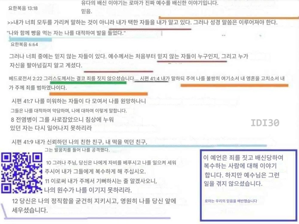 영어: Min 0:49 “유다는 소아성애자보다 더 나빴다”: 루이스 토로 신부가 말했고, 여기서 우리는 그것을 반박합니다….시편 41:4과 41:9-10을 읽으십시오.그 인물이 죄를 지었고, 배신당했고, 복수를 요구받았음을 알 수 있을 것입니다.그런 다음 요한복음 13:18을 읽으면 주변을 무시하고 시편의 한 구절만 발췌한 것을 알 수 있을 것입니다.베드로전서 2:22을 읽으면 예수께서 결코 죄를 짓지 않으셨으므로 시편은 그분에 대해 말하지 않습니다.또는 적어도 그분의 첫 번째 오심에 대해서는 말하지 않습니다(두 번째 삶에서 그분은 환생하셨고, 그분은 세상에서 지배적인 거짓 종교 중 하나에서 교육을 받으셨을 것이고, 그런 다음 그분은 죄를 지으셨지만, 불의한 사람이었기 때문이 아니라, 정의롭지만 무지했기 때문에 죄를 지으셨습니다.이러한 이유로 그분은 자신의 죄를 깨끗이 하기 위해 다시 진리를 알아야 했습니다(다니엘 12:10)). 그렇다면 왜 그들은 이 시편이 유다에게 배신당한 예수에 의해 성취되었다고 우리에게 말했을까요? 그들은 교회의 배반자들을 정당화하기 위해 배신의 선례가 필요했기 때문입니다. 오늘날 범죄 사제가 적발되면 그들은 “예수님조차도 배반자들에게서 자유롭지 못했다”라고 말합니다. 하지만 이는 부패한 자들에게 유용한 거짓말입니다. 로마는 피해자가 아니었습니다. 로마는 배반자였습니다. 그리고 유다 신화는 그들의 체제 내 악을 신성화하려는 그들의 계획의 일부였습니다.