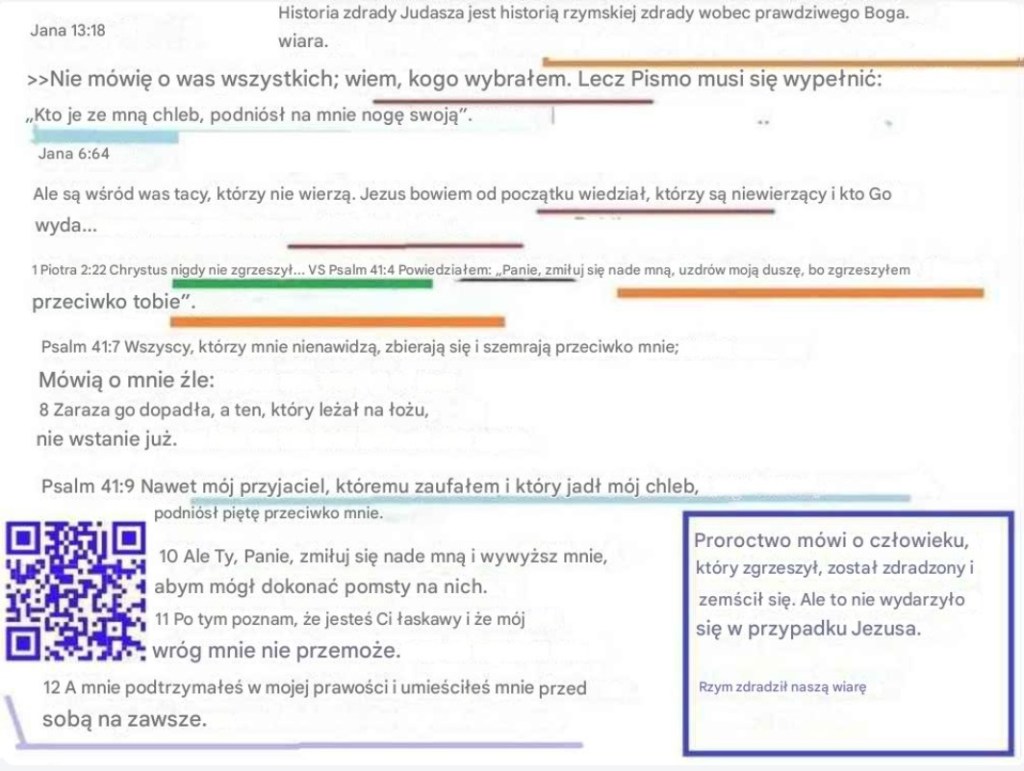 Drodzy przyjaciele, historia zdrady Judasza Iskarioty jest wymysłem Rzymian, którzy chcieli usprawiedliwić swój Kościół. Tutaj, na przykład, ten ksiądz mówi nam, że Jezus został zdradzony i że to nie spowodowało, że Jezus zniszczył swój Kościół. Pamiętajcie jednak, że obaliłem tradycję Judasza i że Kościół, który rzekomo jest Kościołem Chrystusa, jest Kościołem Rzymu, ponieważ Kościół Chrystusa nie kłamał. Zauważcie. Uważajcie, Biblia jest dziełem Rzymu; nie jest prawdziwym słowem Chrystusa. Zauważcie, przeczytajcie słowa Luisa Toro: „Kiedy Chrystus żył, nie umarł, będąc najlepszym nauczycielem, najlepszym założycielem, najlepszym papieżem, jeden z Jego uczniów, Judasz, popełnił największy skandal niż zgwałcenie dziecka”. Spójrzcie, jakie okropne, jakie okropne to, co mówi [Luis Toro]. Porównuje okropny gwałt na dziecku, który jest czymś okropnym, z sytuacją, która nigdy nie miała miejsca. Jakie okropne. To naprawdę godne pogardy, jakby nie było nic gorszego od tego. [Luis Toro: „Wydał swego nauczyciela, syna Bożego, niewinnego, a potem…” a dziecko nie jest niewinne? Mam na myśli, że porównują coś, co nie istniało, z czymś, co istnieje, czyli gwałty na dzieciach. Zdrada Judasza nie istniała. Spójrz na argumenty. Co tu jest napisane? Według Jana 13:18 Jezus został wydany, aby spełniło się proroctwo z Psalmu 41. Ale Psalm 41 mówi, że zdradzony zgrzeszył, a mimo to mówią nam, że Jezus nie zgrzeszył. To nie pasuje, ponieważ to rzymski wynalazek. Oto argumenty. A najgorsze ze wszystkiego jest to, że ten facet mówi, że tak jak był Judasz wśród 12, tak mówi, że na 12 księży przypada pedofil, jest Judasz. Tak właśnie mówi. [Luis Toro: „Największy skandal jak dotąd, popełnił samobójstwo”] To naprawdę straszne. [Luis Toro: „Jednak Chrystus nie zniszczył Kościoła ani nie przestał on być Kościołem Chrystusa”.] Czytaj więcej tutaj, [Luis Toro: „A tym bardziej. Kontynuuję. Teologicznie, co mówi Biblia? Że na 12 kapłanów przypada jeden, Judasz. Jeśli dobrze policzysz, to…”], cóż, widzieliście to, widzieliście to. Odrzucam fałszywe argumenty Kościoła rzymskiego przeciwko sprawiedliwości. Aby pomóc mi w tej świętej misji, stworzyłem, z pomocą sztucznej inteligencji, wiele nowych sformułowań, które rozbijają złośliwe nauki prześladowców i fałszywych świadków, którzy rozpowszechniają je w imię interesów Cesarstwa Rzymskiego.
