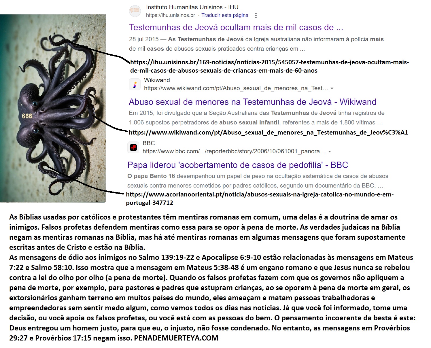 Caros amigos, a história da traição de Judas Iscariotes é uma invenção dos romanos para justificar a sua Igreja. Aqui, este sacerdote, por exemplo, diz-nos que Jesus foi traído e que isso não levou Jesus a destruir a sua Igreja. Mas recordem que refutei a tradição de Judas e que a Igreja que se diz ser de Cristo é a Igreja de Roma, porque a Igreja de Cristo não mentiu. Observem. Tenham cuidado, a Bíblia é uma obra de Roma; não é a verdadeira palavra de Cristo. Observem, leiam as palavras de Luís Toro: “Quando Cristo estava vivo, não morto, sendo o melhor mestre, o melhor fundador, o melhor papa, um dos seus discípulos, Judas, cometeu o maior escândalo do que violar uma criança.” Vejam que horrível, que horrível o que [Luís Toro] diz. Compara a violação horrível de uma criança, que é algo horrível, com uma situação que nunca aconteceu. Que horrível. É realmente desprezível, como se não houvesse nada pior do que isso. [Luis Toro: “Entregou o seu mestre, o filho de Deus, o inocente, e depois…” e uma criança não é inocente? Quer dizer, estão a comparar algo que não existia com algo que existe, que são estas violações de crianças. A traição de Judas não existiu. Veja os argumentos. O que diz aqui? De acordo com João 13:18, Jesus foi entregue para que se cumprisse uma profecia do Salmo 41. Mas o Salmo 41 diz que o traído pecou, mas dizem-nos que Jesus não pecou. Não se adequa porque é uma invenção romana. Aqui lê os argumentos. E o pior de tudo é que este tipo diz que, tal como havia um Judas entre os 12, então diz que por cada 12 padres há um pedófilo, há um Judas. É isso que ele diz. [Luis Toro: “O maior escândalo até agora, ele matou-se”] É realmente terrível. [Luis Toro: “No entanto, Cristo não destruiu a Igreja, nem ela deixou de ser a Igreja de Cristo.”] Leia mais aqui, [Luis Toro: “Muito menos. Continuo. Teologicamente, o que diz a Bíblia? Que por cada 12 sacerdotes há um, Judas. Se fizerem as contas, então…”], bem, vocês viram, vocês viram. Nego os falsos argumentos da Igreja de Roma contra a justiça. Para me ajudar nesta sagrada missão, criei, com a ajuda da inteligência artificial, muitas frases novas que pulverizam os ensinamentos maliciosos dos perseguidores e das falsas testemunhas, que os espalham em nome dos interesses do Império Romano.