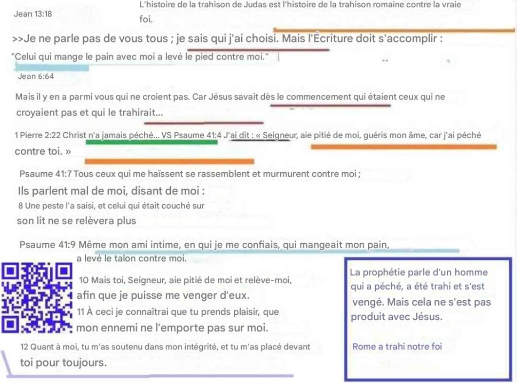 Chers amis, l’histoire de la trahison de Judas Iscariote est une invention des Romains pour justifier leur Église. Ici, ce prêtre, par exemple, nous dit que Jésus a été trahi et que cela ne l’a pas poussé à détruire son Église. Mais rappelez-vous que j’ai réfuté la tradition judaïque et que l’Église que l’on dit être celle du Christ est l’Église de Rome, car l’Église du Christ n’a pas menti. Observez. Soyez prudents, la Bible est une œuvre de Rome ; elle n’est pas la véritable parole du Christ. Observez, lisez les paroles de Luis Toro : « Lorsque le Christ était vivant, et non mort, étant le meilleur enseignant, le meilleur fondateur, le meilleur pape, l’un de ses disciples, Judas, a commis le plus grand scandale que le viol d’un enfant. » Voyez comme ce que dit [Luis Toro] est horrible, horrible. Il compare le viol horrible d’un enfant, qui est quelque chose d’horrible, à une situation qui n’a jamais eu lieu. Quelle horreur ! C’est vraiment méprisable, comme s’il n’y avait rien de pire. [Luis Toro : « Il a livré son maître, le fils de Dieu, l’innocent, et puis… » Et un enfant n’est pas innocent ? Ils comparent quelque chose qui n’existait pas à quelque chose qui existe, à savoir ces viols d’enfants. La trahison de Judas n’a pas existé. Regardez les arguments. Que dit-on ici ? Selon Jean 13:18, Jésus a été livré pour qu’une prophétie du Psaume 41 s’accomplisse. Or, le Psaume 41 dit que celui qui a été trahi a péché, et pourtant, ils nous disent que Jésus n’a pas péché. Cela ne colle pas, car c’est une invention romaine. Vous lisez ici les arguments. Et le pire, c’est que cet homme dit que, tout comme il y avait un Judas parmi les 12, il dit que pour 12 prêtres, il y a un pédophile, il y a un Judas. C’est ce qu’il dit. [Luis Toro : « Le plus grand scandale à ce jour, il s’est suicidé. »] C’est vraiment terrible. [Luis Toro : « Cependant, le Christ n’a pas détruit l’Église, ni cessé d’être l’Église du Christ. »] Lire la suite ici, [Luis Toro : « Beaucoup moins. Je continue. Théologiquement, que dit la Bible ? Que pour 12 prêtres, il y en a un, Judas. Si vous faites le calcul, alors… »], eh bien, vous l’avez vu, vous l’avez vu. Je nie les faux arguments de l’Église de Rome contre la justice. Pour m’aider dans cette mission sacrée, j’ai créé, avec l’aide de l’intelligence artificielle, de nombreuses nouvelles phrases qui pulvérisent les enseignements malveillants des persécuteurs et des faux témoins, qui les diffusent au nom des intérêts de l’Empire romain.