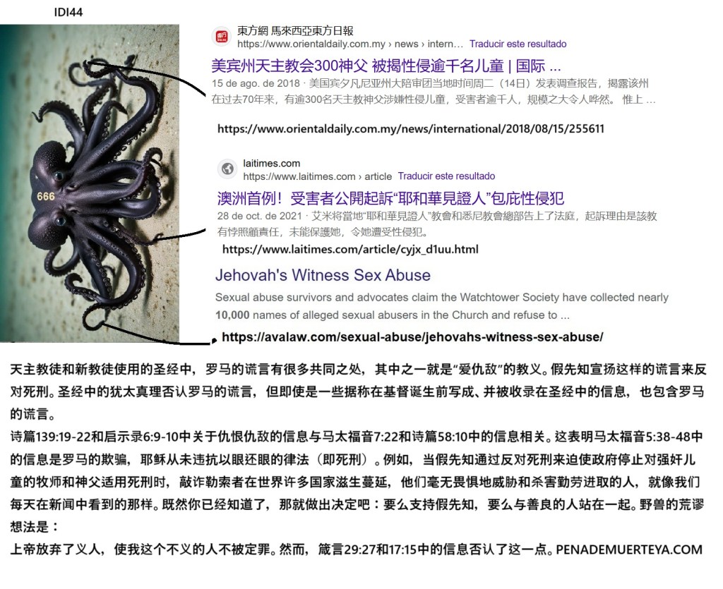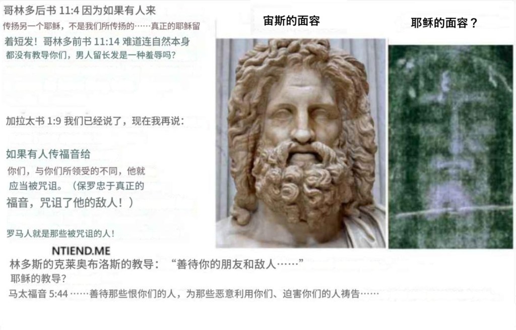 并非巧合,与宙斯的祭司一样,那些其过去定义了圣经内容的教会祭司也实行独身生活。宙斯的雕像在梵蒂冈,其面容被展示成基督的面容,这也不是巧合。圣经中出现希腊语短语,仿佛是基督的教导,这也不是巧合。你们知道,在古希腊,宙斯的祭司允许恋童行为吗?因此,这些团体新闻中出现的腐败成果也不是巧合。他们反对“以眼还眼”也不是巧合:他们不希望实施公正的死刑, 因为如果合法化,这也会影响到他们。